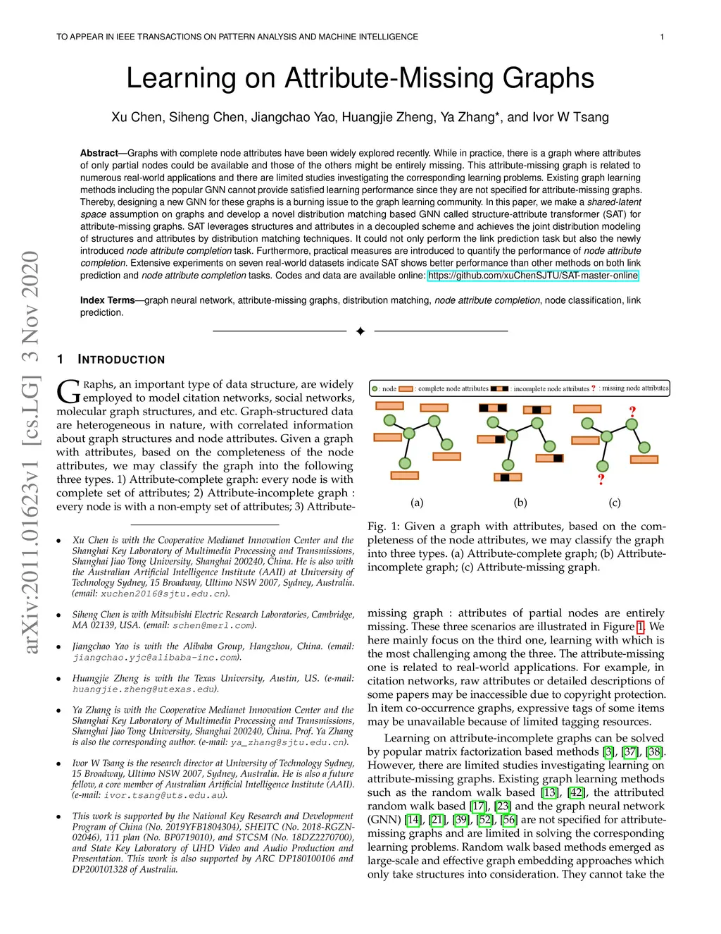Graphs with complete node attributes have been widely explored recently. While in practice, there is a graph where attributes of only partial nodes could be available and those of the others might be entirely missing. This attribute-missing graph is related to numerous real-world applications and there are limited studies investigating the corresponding learning problems. Existing graph learning methods including the popular GNN cannot provide satisfied learning performance since they are not specified for attribute-missing graphs. Thereby, designing a new GNN for these graphs is a burning issue to the graph learning community. In this paper, we make a shared-latent space assumption on graphs and develop a novel distribution matching based GNN called structure-attribute transformer (SAT) for attribute-missing graphs. SAT leverages structures and attributes in a decoupled scheme and achieves the joint distribution modeling of structures and attributes by distribution matching techniques. It could not only perform the link prediction task but also the newly introduced node attribute completion task. Furthermore, practical measures are introduced to quantify the performance of node attribute completion. Extensive experiments on seven real-world datasets indicate SAT shows better performance than other methods on both link prediction and node attribute completion tasks. Codes and data are available online: https://github.com/xuChenSJTU/SAT-master-online