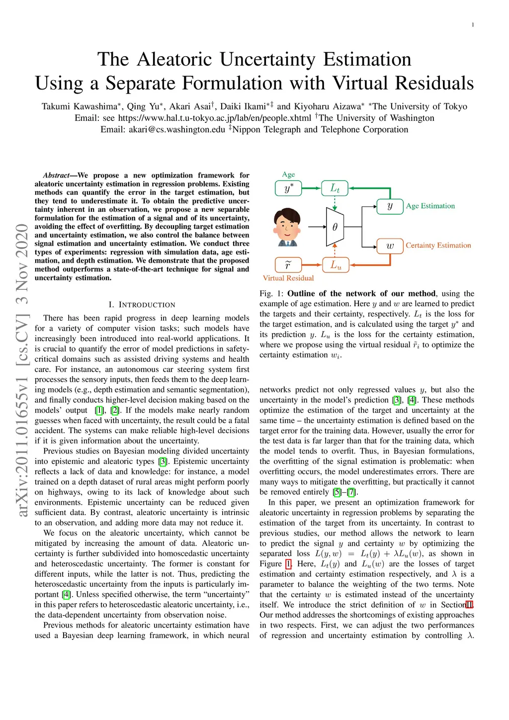 We propose a new optimization framework for aleatoric uncertainty estimation in regression problems. Existing methods can quantify the error in the target estimation, but they tend to underestimate it. To obtain the predictive uncertainty inherent in an observation, we propose a new separable formulation for the estimation of a signal and of its uncertainty, avoiding the effect of overfitting. By decoupling target estimation and uncertainty estimation, we also control the balance between signal estimation and uncertainty estimation. We conduct three types of experiments: regression with simulation data, age estimation, and depth estimation. We demonstrate that the proposed method outperforms a state-of-the-art technique for signal and uncertainty estimation.