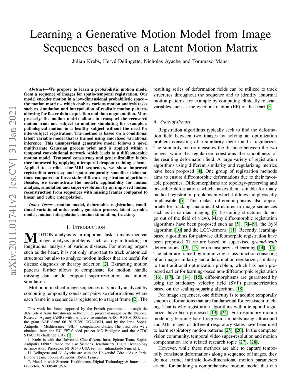 We propose to learn a probabilistic motion model from a sequence of images for spatio-temporal registration. Our model encodes motion in a low-dimensional probabilistic space - the motion matrix - which enables various motion analysis tasks such as simulation and interpolation of realistic motion patterns allowing for faster data acquisition and data augmentation. More precisely, the motion matrix allows to transport the recovered motion from one subject to another simulating for example a pathological motion in a healthy subject without the need for inter-subject registration. The method is based on a conditional latent variable model that is trained using amortized variational inference. This unsupervised generative model follows a novel multivariate Gaussian process prior and is applied within a temporal convolutional network which leads to a diffeomorphic motion model. Temporal consistency and generalizability is further improved by applying a temporal dropout training scheme. Applied to cardiac cine-MRI sequences, we show improved registration accuracy and spatio-temporally smoother deformations compared to three state-of-the-art registration algorithms. Besides, we demonstrate the model's applicability for motion analysis, simulation and super-resolution by an improved motion reconstruction from sequences with missing frames compared to linear and cubic interpolation.