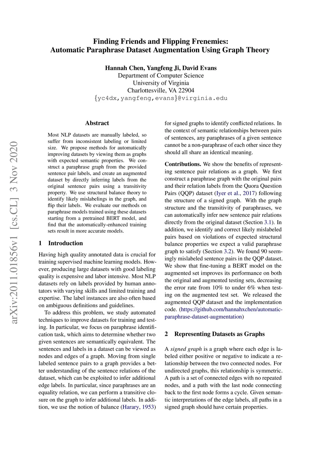 Most NLP datasets are manually labeled, so suffer from inconsistent labeling or limited size. We propose methods for automatically improving datasets by viewing them as graphs with expected semantic properties. We construct a paraphrase graph from the provided sentence pair labels, and create an augmented dataset by directly inferring labels from the original sentence pairs using a transitivity property. We use structural balance theory to identify likely mislabelings in the graph, and flip their labels. We evaluate our methods on paraphrase models trained using these datasets starting from a pretrained BERT model, and find that the automatically-enhanced training sets result in more accurate models.