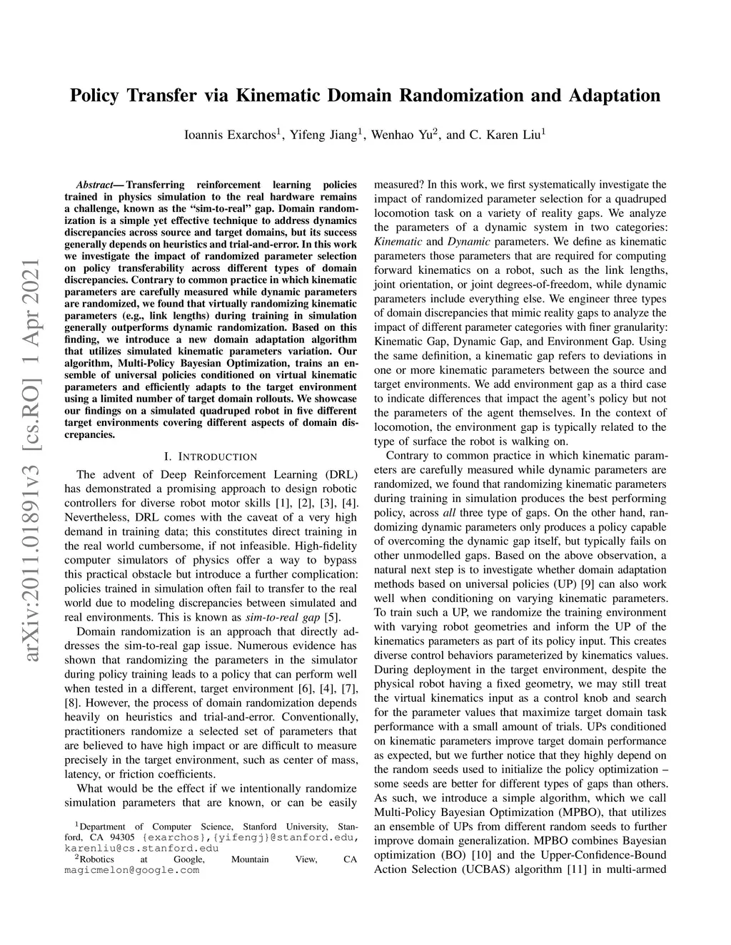 Transferring reinforcement learning policies trained in physics simulation to the real hardware remains a challenge, known as the "sim-to-real" gap. Domain randomization is a simple yet effective technique to address dynamics discrepancies across source and target domains, but its success generally depends on heuristics and trial-and-error. In this work we investigate the impact of randomized parameter selection on policy transferability across different types of domain discrepancies. Contrary to common practice in which kinematic parameters are carefully measured while dynamic parameters are randomized, we found that virtually randomizing kinematic parameters (e.g., link lengths) during training in simulation generally outperforms dynamic randomization. Based on this finding, we introduce a new domain adaptation algorithm that utilizes simulated kinematic parameters variation. Our algorithm, Multi-Policy Bayesian Optimization, trains an ensemble of universal policies conditioned on virtual kinematic parameters and efficiently adapts to the target environment using a limited number of target domain rollouts. We showcase our findings on a simulated quadruped robot in five different target environments covering different aspects of domain discrepancies.