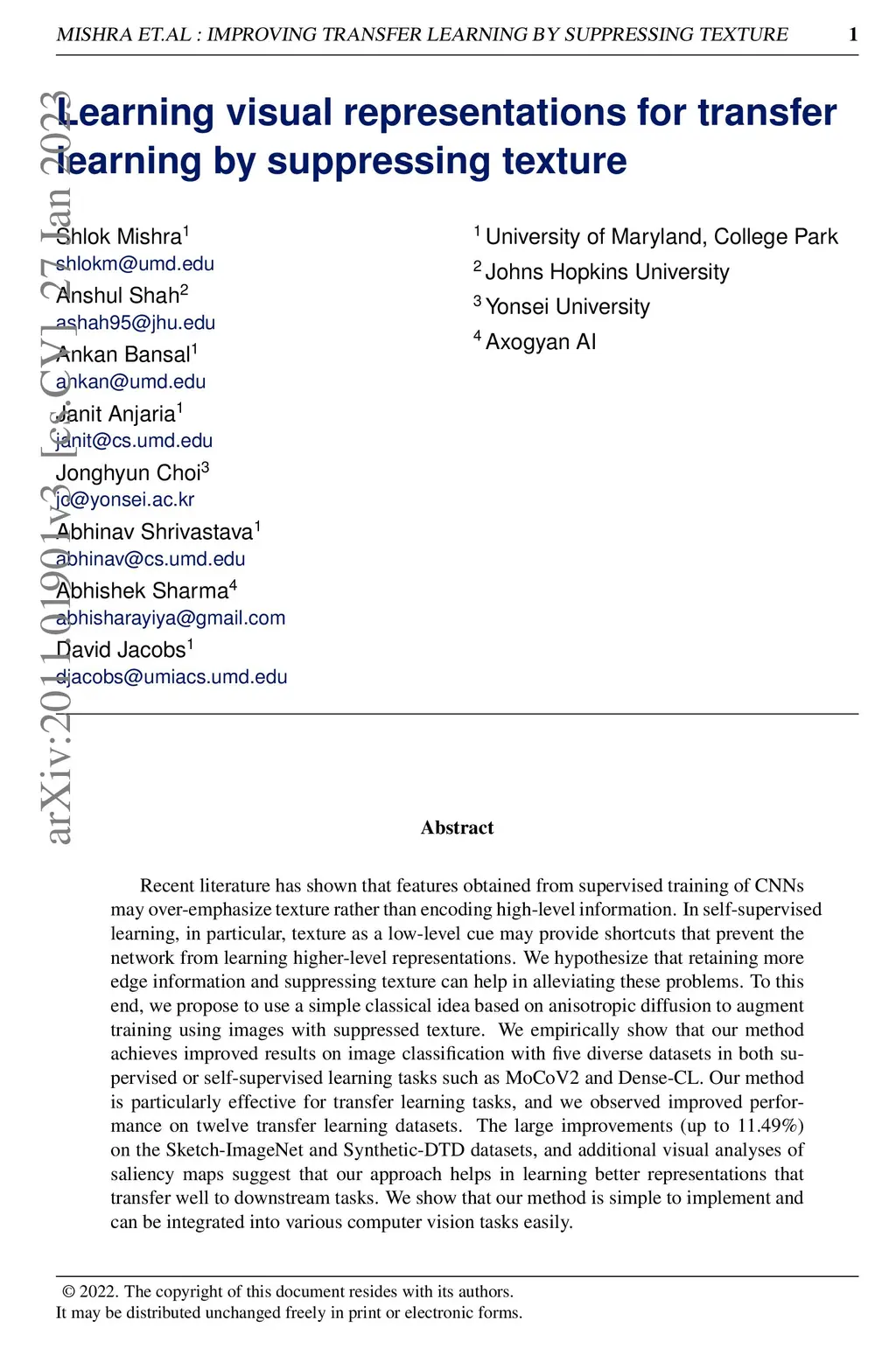 Recent literature has shown that features obtained from supervised training of CNNs may over-emphasize texture rather than encoding high-level information. In self-supervised learning in particular, texture as a low-level cue may provide shortcuts that prevent the network from learning higher level representations. To address these problems we propose to use classic methods based on anisotropic diffusion to augment training using images with suppressed texture. This simple method helps retain important edge information and suppress texture at the same time. We empirically show that our method achieves state-of-the-art results on object detection and image classification with eight diverse datasets in either supervised or self-supervised learning tasks such as MoCoV2 and Jigsaw. Our method is particularly effective for transfer learning tasks and we observed improved performance on five standard transfer learning datasets. The large improvements (up to 11.49\%) on the Sketch-ImageNet dataset, DTD dataset and additional visual analyses with saliency maps suggest that our approach helps in learning better representations that better transfer.