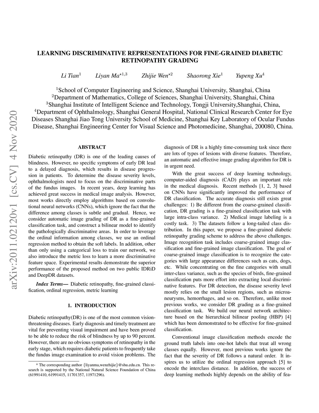Diabetic retinopathy (DR) is one of the leading causes of blindness. However, no specific symptoms of early DR lead to a delayed diagnosis, which results in disease progression in patients. To determine the disease severity levels, ophthalmologists need to focus on the discriminative parts of the fundus images. In recent years, deep learning has achieved great success in medical image analysis. However, most works directly employ algorithms based on convolutional neural networks (CNNs), which ignore the fact that the difference among classes is subtle and gradual. Hence, we consider automatic image grading of DR as a fine-grained classification task, and construct a bilinear model to identify the pathologically discriminative areas. In order to leverage the ordinal information among classes, we use an ordinal regression method to obtain the soft labels. In addition, other than only using a categorical loss to train our network, we also introduce the metric loss to learn a more discriminative feature space. Experimental results demonstrate the superior performance of the proposed method on two public IDRiD and DeepDR datasets.