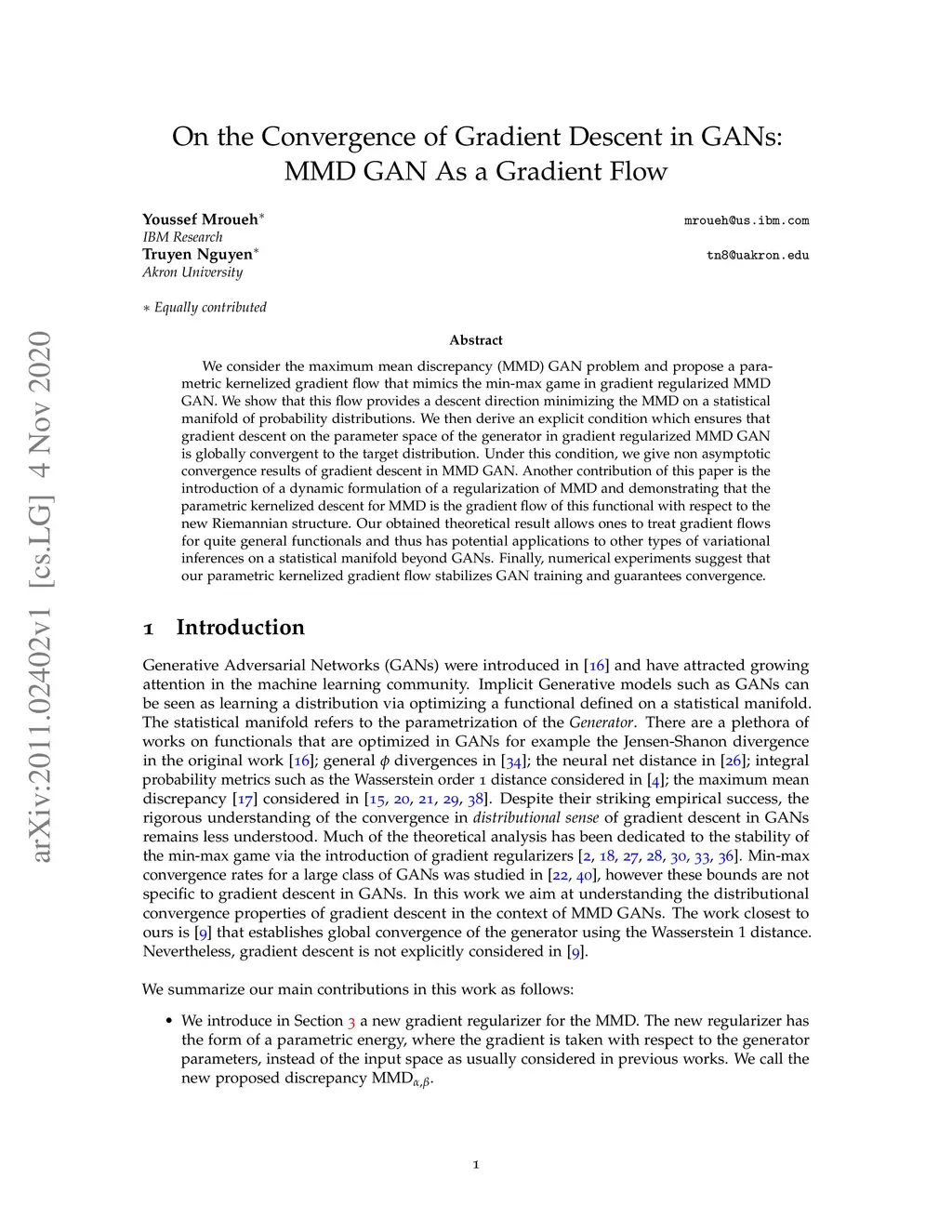 We consider the maximum mean discrepancy () GAN problem and propose a parametric kernelized gradient flow that mimics the min-max game in gradient regularized GAN. We show that this flow provides a descent direction minimizing the on a statistical manifold of probability distributions. We then derive an explicit condition which ensures that gradient descent on the parameter space of the generator in gradient regularized GAN is globally convergent to the target distribution. Under this condition, we give non asymptotic convergence results of gradient descent in MMD GAN. Another contribution of this paper is the introduction of a dynamic formulation of a regularization of and demonstrating that the parametric kernelized descent for is the gradient flow of this functional with respect to the new Riemannian structure. Our obtained theoretical result allows ones to treat gradient flows for quite general functionals and thus has potential applications to other types of variational inferences on a statistical manifold beyond GANs. Finally, numerical experiments suggest that our parametric kernelized gradient flow stabilizes GAN training and guarantees convergence.