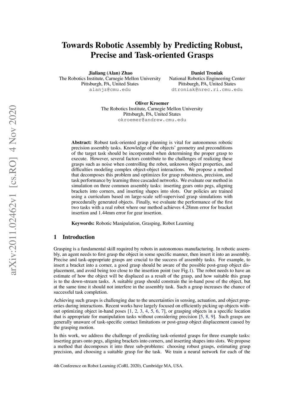 Robust task-oriented grasp planning is vital for autonomous robotic precision assembly tasks. Knowledge of the objects' geometry and preconditions of the target task should be incorporated when determining the proper grasp to execute. However, several factors contribute to the challenges of realizing these grasps such as noise when controlling the robot, unknown object properties, and difficulties modeling complex object-object interactions. We propose a method that decomposes this problem and optimizes for grasp robustness, precision, and task performance by learning three cascaded networks. We evaluate our method in simulation on three common assembly tasks: inserting gears onto pegs, aligning brackets into corners, and inserting shapes into slots. Our policies are trained using a curriculum based on large-scale self-supervised grasp simulations with procedurally generated objects. Finally, we evaluate the performance of the first two tasks with a real robot where our method achieves 4.28mm error for bracket insertion and 1.44mm error for gear insertion.