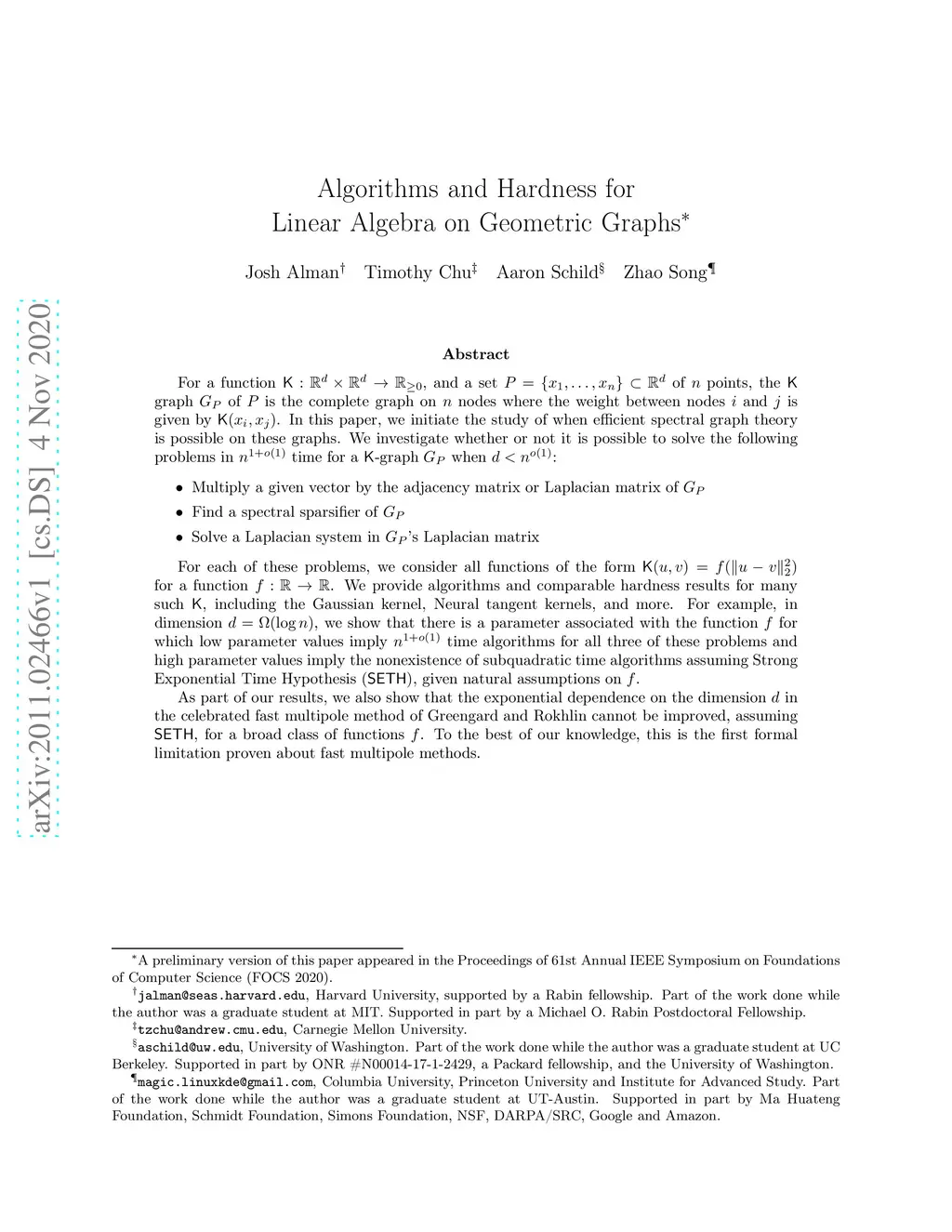 For a function , and a set of points, the graph of is the complete graph on nodes where the weight between nodes and is given by . In this paper, we initiate the study of when efficient spectral graph theory is possible on these graphs. We investigate whether or not it is possible to solve the following problems in time for a -graph when : Multiply a given vector by the adjacency matrix or Laplacian matrix of Find a spectral sparsifier of Solve a Laplacian system in 's Laplacian matrix For each of these problems, we consider all functions of the form for a function . We provide algorithms and comparable hardness results for many such , including the Gaussian kernel, Neural tangent kernels, and more. For example, in dimension , we show that there is a parameter associated with the function for which low parameter values imply time algorithms for all three of these problems and high parameter values imply the nonexistence of subquadratic time algorithms assuming Strong Exponential Time Hypothesis (), given natural assumptions on . As part of our results, we also show that the exponential dependence on the dimension in the celebrated fast multipole method of Greengard and Rokhlin cannot be improved, assuming , for a broad class of functions . To the best of our knowledge, this is the first formal limitation proven about fast multipole methods.