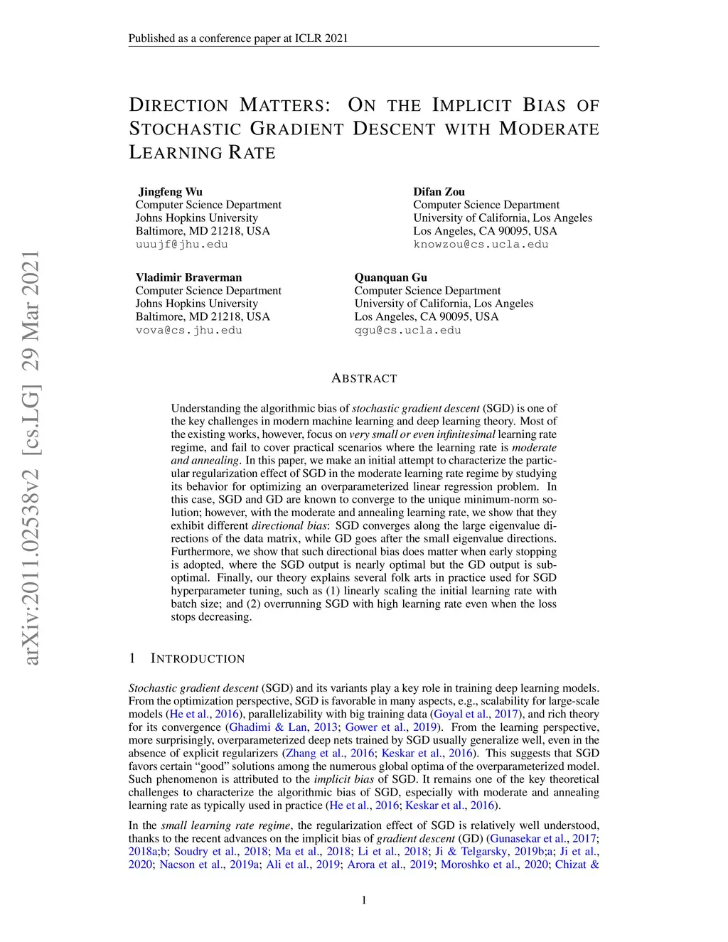 Understanding the algorithmic bias of \emph{stochastic gradient descent} (SGD) is one of the key challenges in modern machine learning and deep learning theory. Most of the existing works, however, focus on \emph{very small or even infinitesimal} learning rate regime, and fail to cover practical scenarios where the learning rate is \emph{moderate and annealing}. In this paper, we make an initial attempt to characterize the particular regularization effect of SGD in the moderate learning rate regime by studying its behavior for optimizing an overparameterized linear regression problem. In this case, SGD and GD are known to converge to the unique minimum-norm solution; however, with the moderate and annealing learning rate, we show that they exhibit different \emph{directional bias}: SGD converges along the large eigenvalue directions of the data matrix, while GD goes after the small eigenvalue directions. Furthermore, we show that such directional bias does matter when early stopping is adopted, where the SGD output is nearly optimal but the GD output is suboptimal. Finally, our theory explains several folk arts in practice used for SGD hyperparameter tuning, such as (1) linearly scaling the initial learning rate with batch size; and (2) overrunning SGD with high learning rate even when the loss stops decreasing.