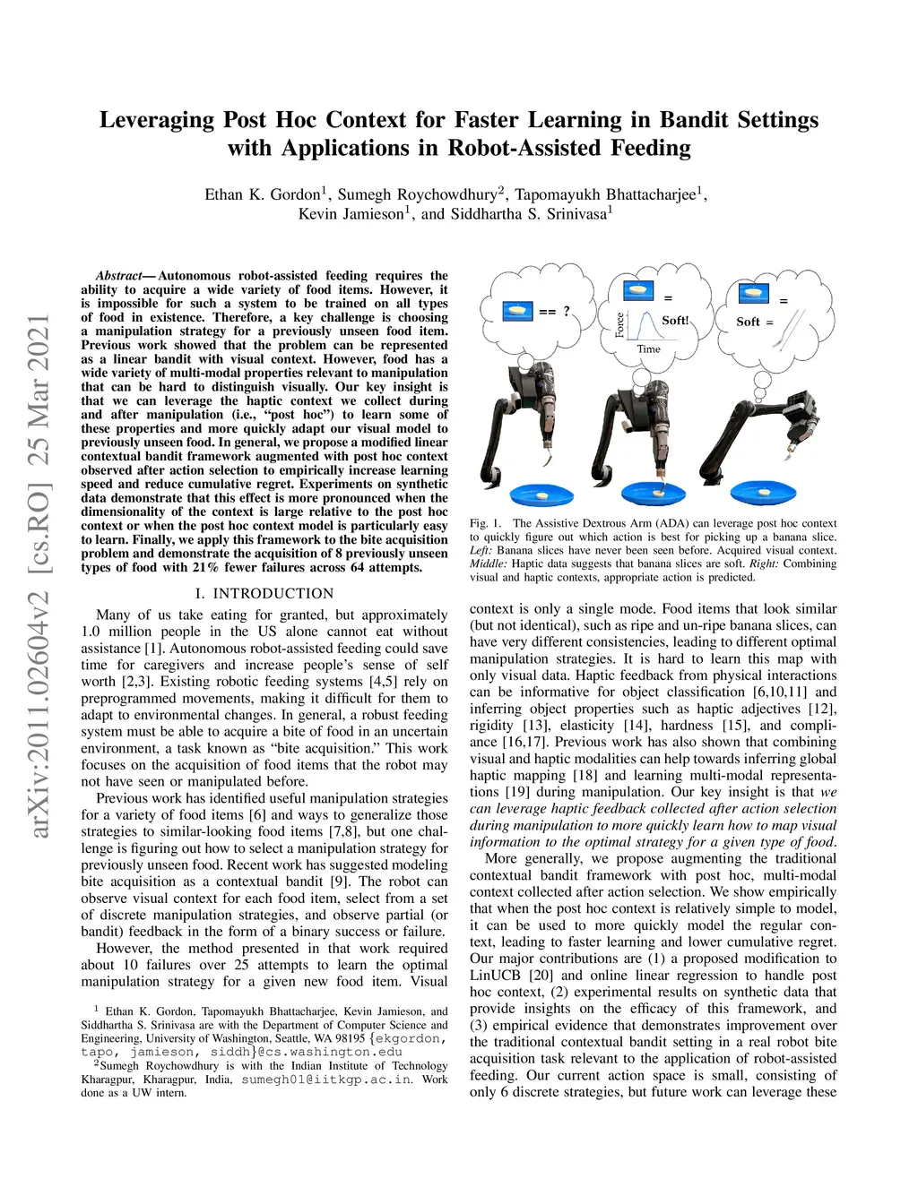 Autonomous robot-assisted feeding requires the ability to acquire a wide variety of food items. However, it is impossible for such a system to be trained on all types of food in existence. Therefore, a key challenge is choosing a manipulation strategy for a previously unseen food item. Previous work showed that the problem can be represented as a linear bandit with visual context. However, food has a wide variety of multi-modal properties relevant to manipulation that can be hard to distinguish visually. Our key insight is that we can leverage the haptic context we collect during and after manipulation (i.e., "post hoc") to learn some of these properties and more quickly adapt our visual model to previously unseen food. In general, we propose a modified linear contextual bandit framework augmented with post hoc context observed after action selection to empirically increase learning speed and reduce cumulative regret. Experiments on synthetic data demonstrate that this effect is more pronounced when the dimensionality of the context is large relative to the post hoc context or when the post hoc context model is particularly easy to learn. Finally, we apply this framework to the bite acquisition problem and demonstrate the acquisition of 8 previously unseen types of food with 21% fewer failures across 64 attempts.