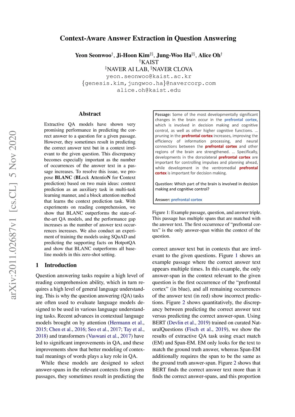 Extractive QA models have shown very promising performance in predicting the correct answer to a question for a given passage. However, they sometimes result in predicting the correct answer text but in a context irrelevant to the given question. This discrepancy becomes especially important as the number of occurrences of the answer text in a passage increases. To resolve this issue, we propose \textbf{BLANC} (\textbf{BL}ock \textbf{A}ttentio\textbf{N} for \textbf{C}ontext prediction) based on two main ideas: context prediction as an auxiliary task in multi-task learning manner, and a block attention method that learns the context prediction task. With experiments on reading comprehension, we show that BLANC outperforms the state-of-the-art QA models, and the performance gap increases as the number of answer text occurrences increases. We also conduct an experiment of training the models using SQuAD and predicting the supporting facts on HotpotQA and show that BLANC outperforms all baseline models in this zero-shot setting.