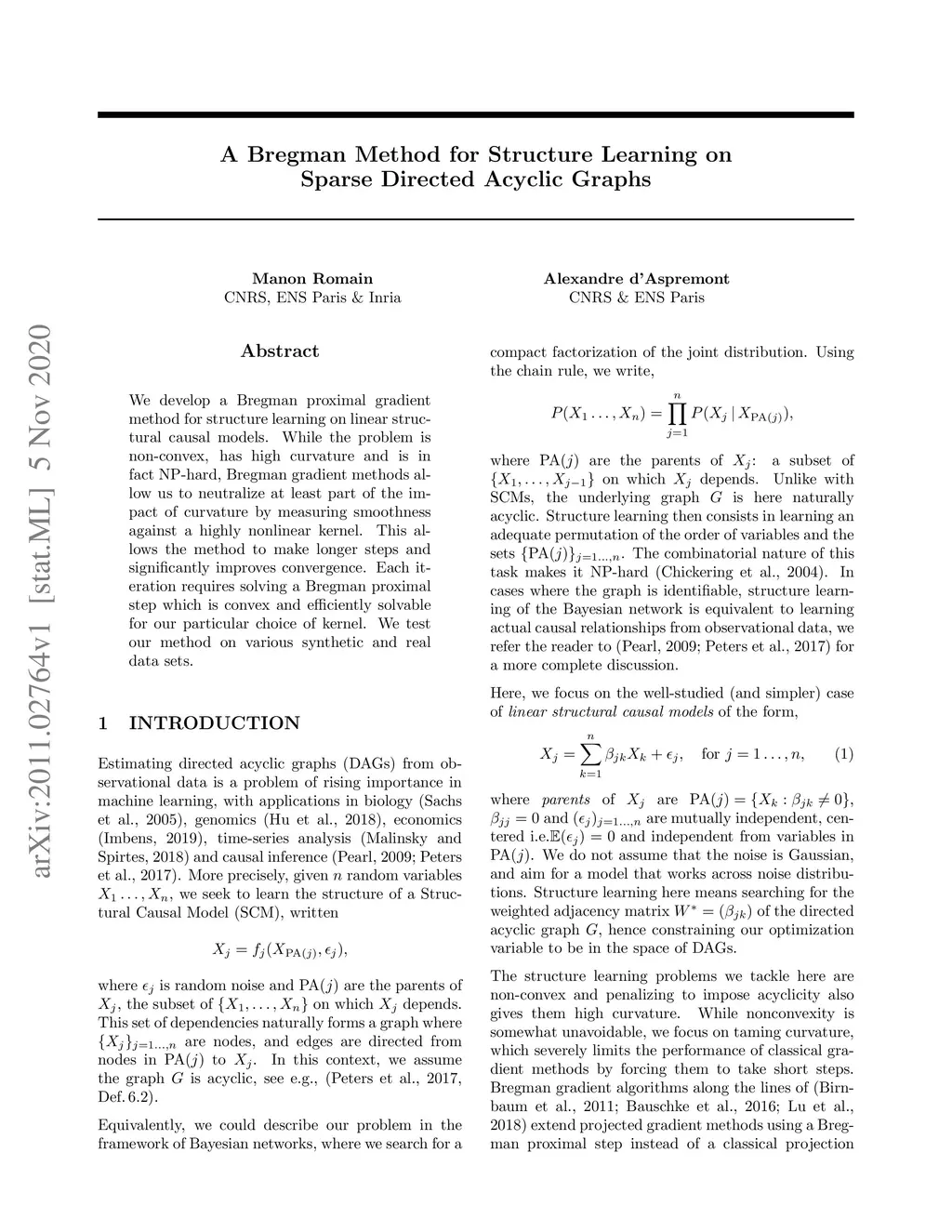 We develop a Bregman proximal gradient method for structure learning on linear structural causal models. While the problem is non-convex, has high curvature and is in fact NP-hard, Bregman gradient methods allow us to neutralize at least part of the impact of curvature by measuring smoothness against a highly nonlinear kernel. This allows the method to make longer steps and significantly improves convergence. Each iteration requires solving a Bregman proximal step which is convex and efficiently solvable for our particular choice of kernel. We test our method on various synthetic and real data sets.