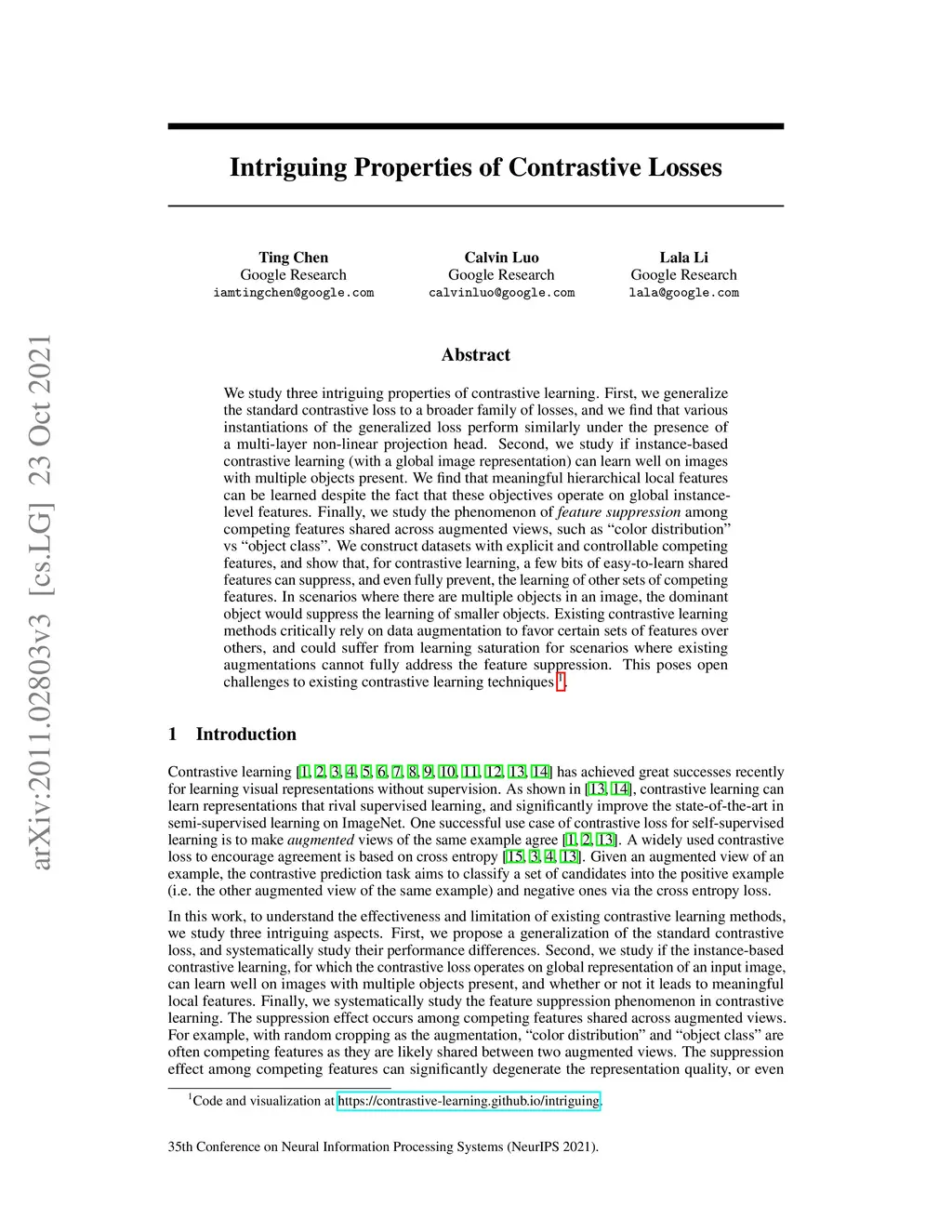 We study three intriguing properties of contrastive learning. First, we generalize the standard contrastive loss to a broader family of losses, and we find that various instantiations of the generalized loss perform similarly under the presence of a multi-layer non-linear projection head. Second, we study if instance-based contrastive learning (with a global image representation) can learn well on images with multiple objects present. We find that meaningful hierarchical local features can be learned despite the fact that these objectives operate on global instance-level features. Finally, we study the phenomenon of feature suppression among competing features shared across augmented views, such as "color distribution" vs "object class". We construct datasets with explicit and controllable competing features, and show that, for contrastive learning, a few bits of easy-to-learn shared features can suppress, and even fully prevent, the learning of other sets of competing features. In scenarios where there are multiple objects in an image, the dominant object would suppress the learning of smaller objects. Existing contrastive learning methods critically rely on data augmentation to favor certain sets of features over others, and could suffer from learning saturation for scenarios where existing augmentations cannot fully address the feature suppression. This poses open challenges to existing contrastive learning techniques.