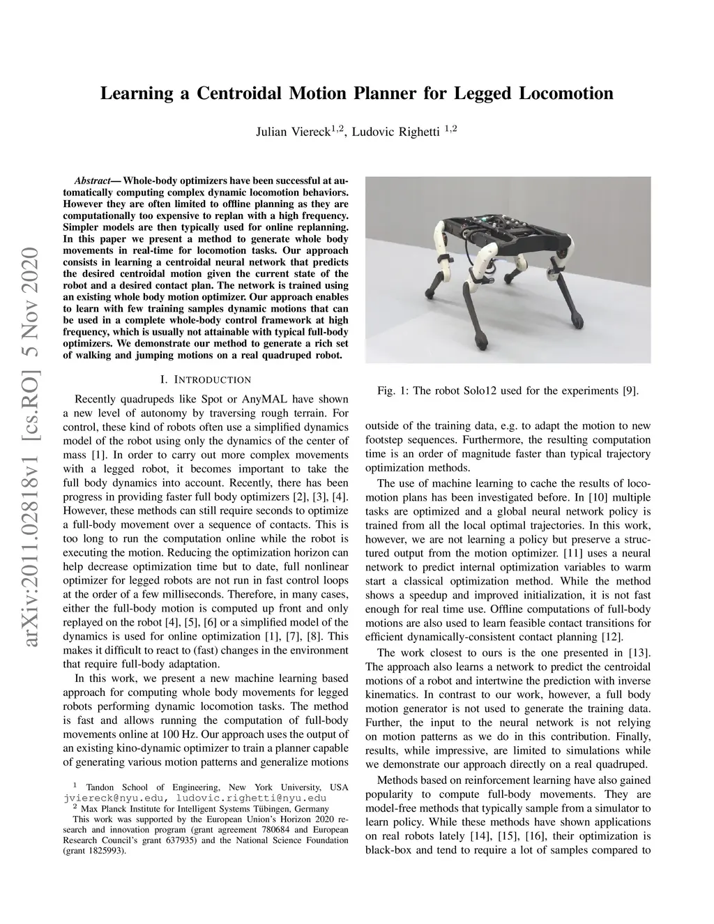 Whole-body optimizers have been successful at automatically computing complex dynamic locomotion behaviors. However they are often limited to offline planning as they are computationally too expensive to replan with a high frequency. Simpler models are then typically used for online replanning. In this paper we present a method to generate whole body movements in real-time for locomotion tasks. Our approach consists in learning a centroidal neural network that predicts the desired centroidal motion given the current state of the robot and a desired contact plan. The network is trained using an existing whole body motion optimizer. Our approach enables to learn with few training samples dynamic motions that can be used in a complete whole-body control framework at high frequency, which is usually not attainable with typical full-body optimizers. We demonstrate our method to generate a rich set of walking and jumping motions on a real quadruped robot.