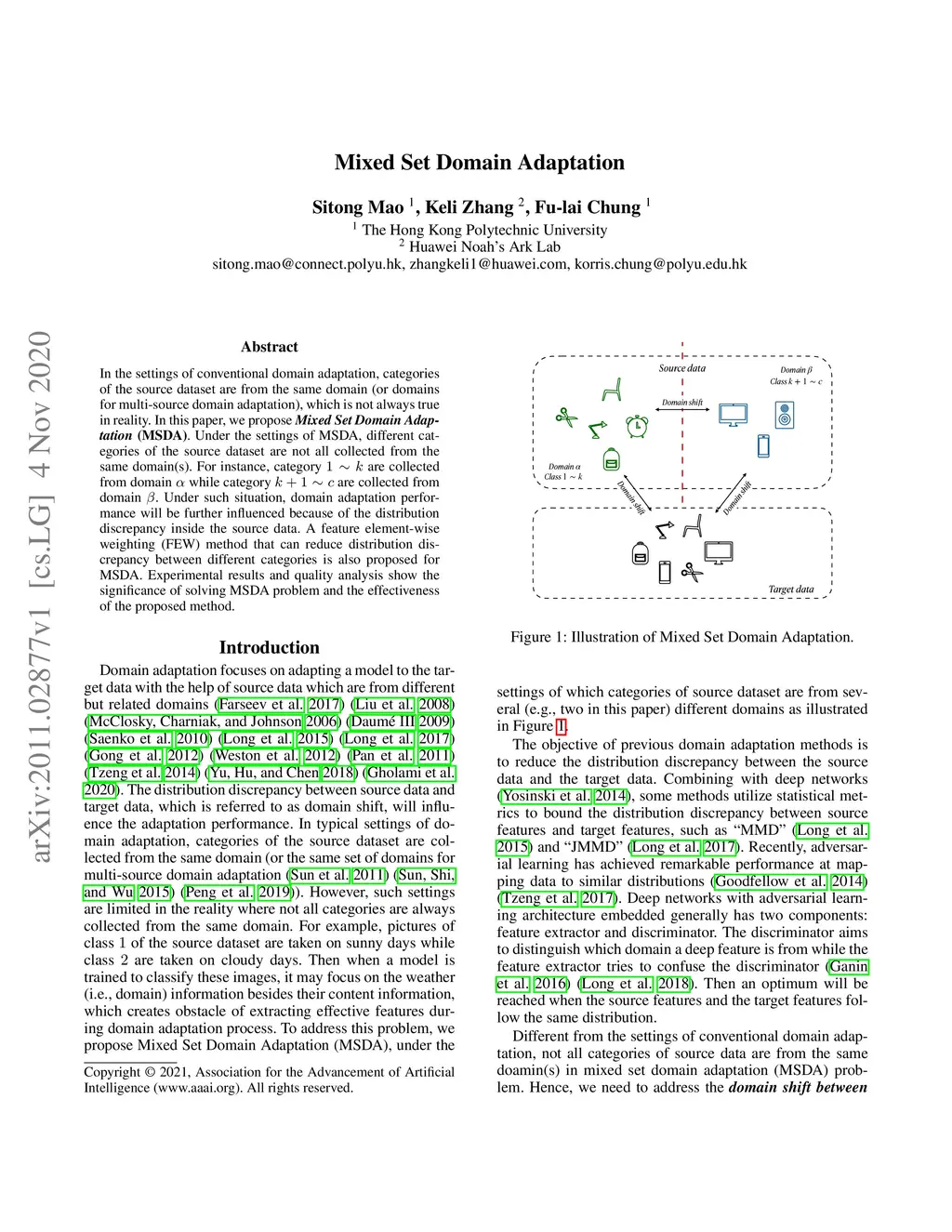 In the settings of conventional domain adaptation, categories of the source dataset are from the same domain (or domains for multi-source domain adaptation), which is not always true in reality. In this paper, we propose \textbf{\textit{Mixed Set Domain Adaptation} (MSDA)}. Under the settings of MSDA, different categories of the source dataset are not all collected from the same domain(s). For instance, category are collected from domain while category are collected from domain . Under such situation, domain adaptation performance will be further influenced because of the distribution discrepancy inside the source data. A feature element-wise weighting (FEW) method that can reduce distribution discrepancy between different categories is also proposed for MSDA. Experimental results and quality analysis show the significance of solving MSDA problem and the effectiveness of the proposed method.