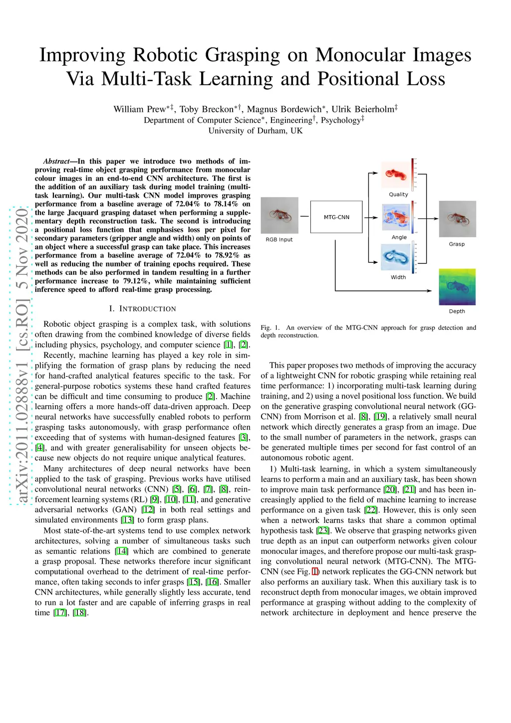 In this paper, we introduce two methods of improving real-time object grasping performance from monocular colour images in an end-to-end CNN architecture. The first is the addition of an auxiliary task during model training (multi-task learning). Our multi-task CNN model improves grasping performance from a baseline average of 72.04% to 78.14% on the large Jacquard grasping dataset when performing a supplementary depth reconstruction task. The second is introducing a positional loss function that emphasises loss per pixel for secondary parameters (gripper angle and width) only on points of an object where a successful grasp can take place. This increases performance from a baseline average of 72.04% to 78.92% as well as reducing the number of training epochs required. These methods can be also performed in tandem resulting in a further performance increase to 79.12% while maintaining sufficient inference speed to afford real-time grasp processing.
