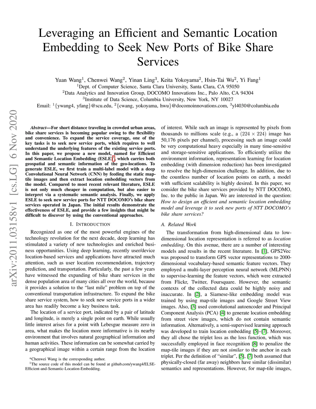 For short distance traveling in crowded urban areas, bike share services are becoming popular owing to the flexibility and convenience. To expand the service coverage, one of the key tasks is to seek new service ports, which requires to well understand the underlying features of the existing service ports. In this paper, we propose a new model, named for Efficient and Semantic Location Embedding (ESLE), which carries both geospatial and semantic information of the geo-locations. To generate ESLE, we first train a multi-label model with a deep Convolutional Neural Network (CNN) by feeding the static map-tile images and then extract location embedding vectors from the model. Compared to most recent relevant literature, ESLE is not only much cheaper in computation, but also easier to interpret via a systematic semantic analysis. Finally, we apply ESLE to seek new service ports for NTT DOCOMO's bike share services operated in Japan. The initial results demonstrate the effectiveness of ESLE, and provide a few insights that might be difficult to discover by using the conventional approaches.