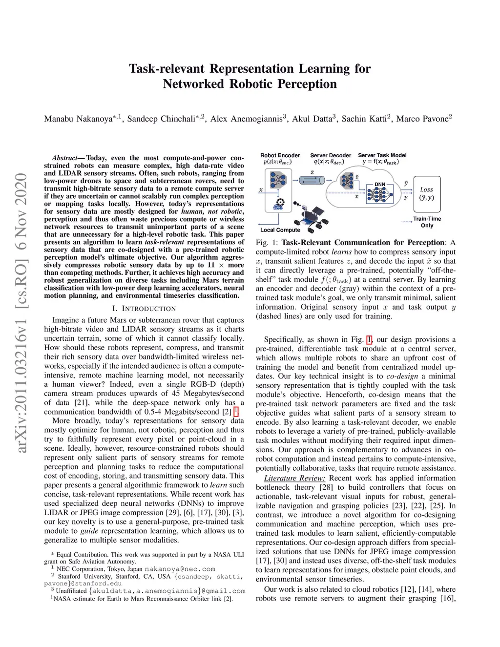 Today, even the most compute-and-power constrained robots can measure complex, high data-rate video and LIDAR sensory streams. Often, such robots, ranging from low-power drones to space and subterranean rovers, need to transmit high-bitrate sensory data to a remote compute server if they are uncertain or cannot scalably run complex perception or mapping tasks locally. However, today's representations for sensory data are mostly designed for human, not robotic, perception and thus often waste precious compute or wireless network resources to transmit unimportant parts of a scene that are unnecessary for a high-level robotic task. This paper presents an algorithm to learn task-relevant representations of sensory data that are co-designed with a pre-trained robotic perception model's ultimate objective. Our algorithm aggressively compresses robotic sensory data by up to 11x more than competing methods. Further, it achieves high accuracy and robust generalization on diverse tasks including Mars terrain classification with low-power deep learning accelerators, neural motion planning, and environmental timeseries classification.