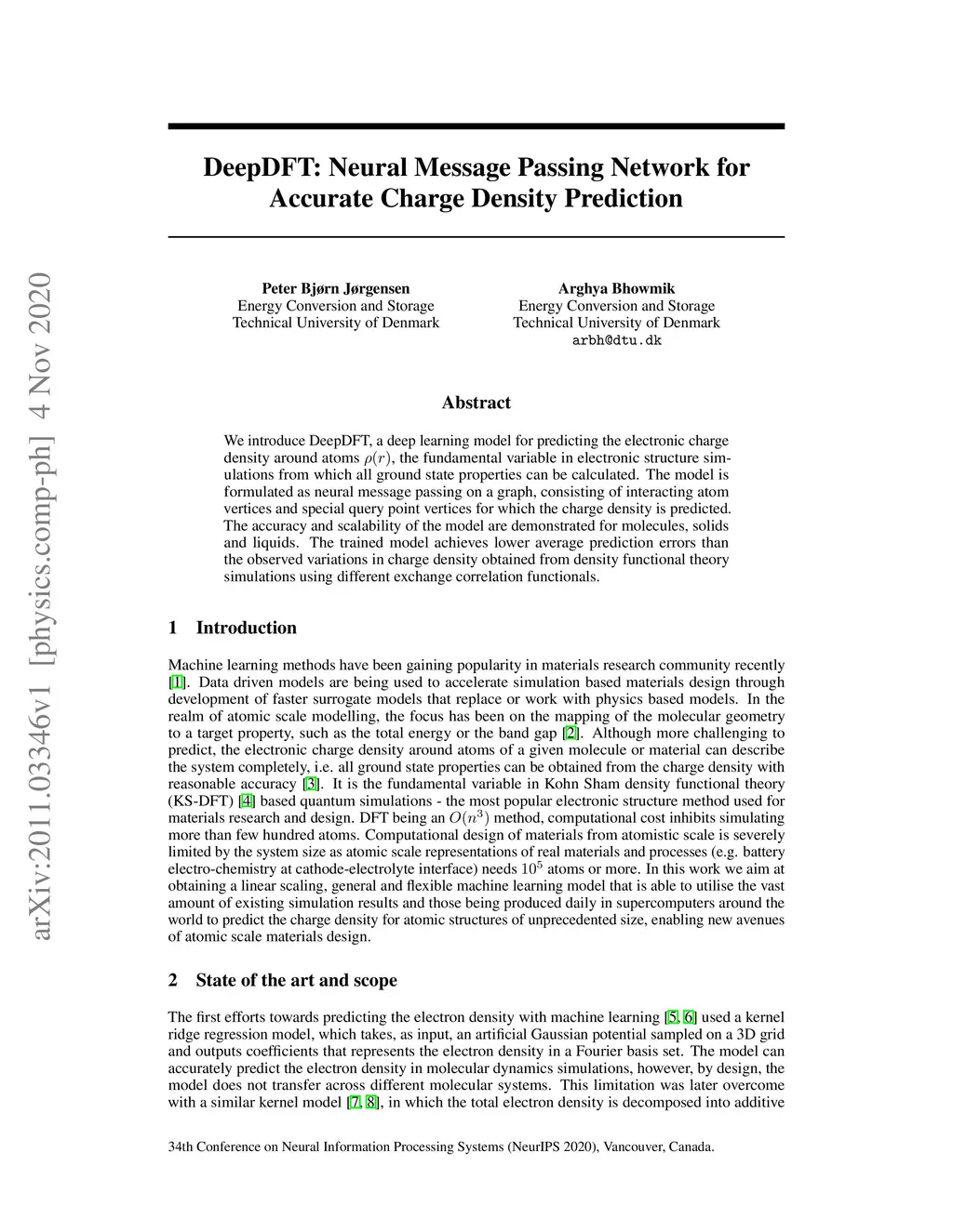 We introduce DeepDFT, a deep learning model for predicting the electronic charge density around atoms, the fundamental variable in electronic structure simulations from which all ground state properties can be calculated. The model is formulated as neural message passing on a graph, consisting of interacting atom vertices and special query point vertices for which the charge density is predicted. The accuracy and scalability of the model are demonstrated for molecules, solids and liquids. The trained model achieves lower average prediction errors than the observed variations in charge density obtained from density functional theory simulations using different exchange correlation functionals.