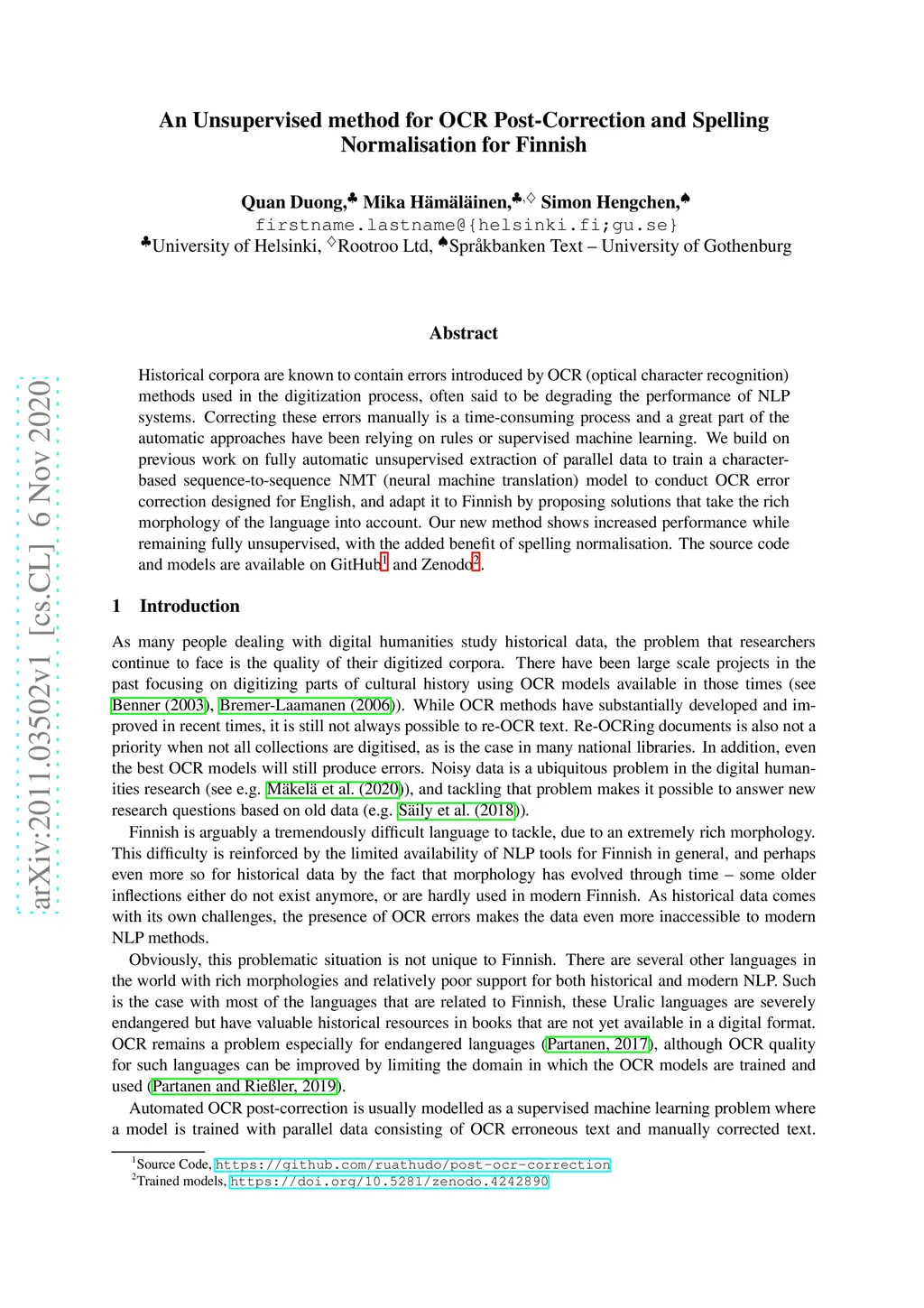 Historical corpora are known to contain errors introduced by OCR (optical character recognition) methods used in the digitization process, often said to be degrading the performance of NLP systems. Correcting these errors manually is a time-consuming process and a great part of the automatic approaches have been relying on rules or supervised machine learning. We build on previous work on fully automatic unsupervised extraction of parallel data to train a character-based sequence-to-sequence NMT (neural machine translation) model to conduct OCR error correction designed for English, and adapt it to Finnish by proposing solutions that take the rich morphology of the language into account. Our new method shows increased performance while remaining fully unsupervised, with the added benefit of spelling normalisation. The source code and models are available on GitHub and Zenodo.