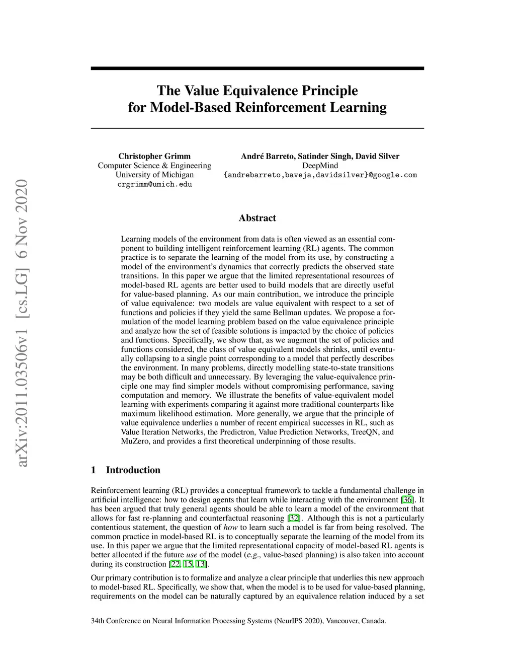 Learning models of the environment from data is often viewed as an essential component to building intelligent reinforcement learning (RL) agents. The common practice is to separate the learning of the model from its use, by constructing a model of the environment's dynamics that correctly predicts the observed state transitions. In this paper we argue that the limited representational resources of model-based RL agents are better used to build models that are directly useful for value-based planning. As our main contribution, we introduce the principle of value equivalence: two models are value equivalent with respect to a set of functions and policies if they yield the same Bellman updates. We propose a formulation of the model learning problem based on the value equivalence principle and analyze how the set of feasible solutions is impacted by the choice of policies and functions. Specifically, we show that, as we augment the set of policies and functions considered, the class of value equivalent models shrinks, until eventually collapsing to a single point corresponding to a model that perfectly describes the environment. In many problems, directly modelling state-to-state transitions may be both difficult and unnecessary. By leveraging the value-equivalence principle one may find simpler models without compromising performance, saving computation and memory. We illustrate the benefits of value-equivalent model learning with experiments comparing it against more traditional counterparts like maximum likelihood estimation. More generally, we argue that the principle of value equivalence underlies a number of recent empirical successes in RL, such as Value Iteration Networks, the Predictron, Value Prediction Networks, TreeQN, and MuZero, and provides a first theoretical underpinning of those results.