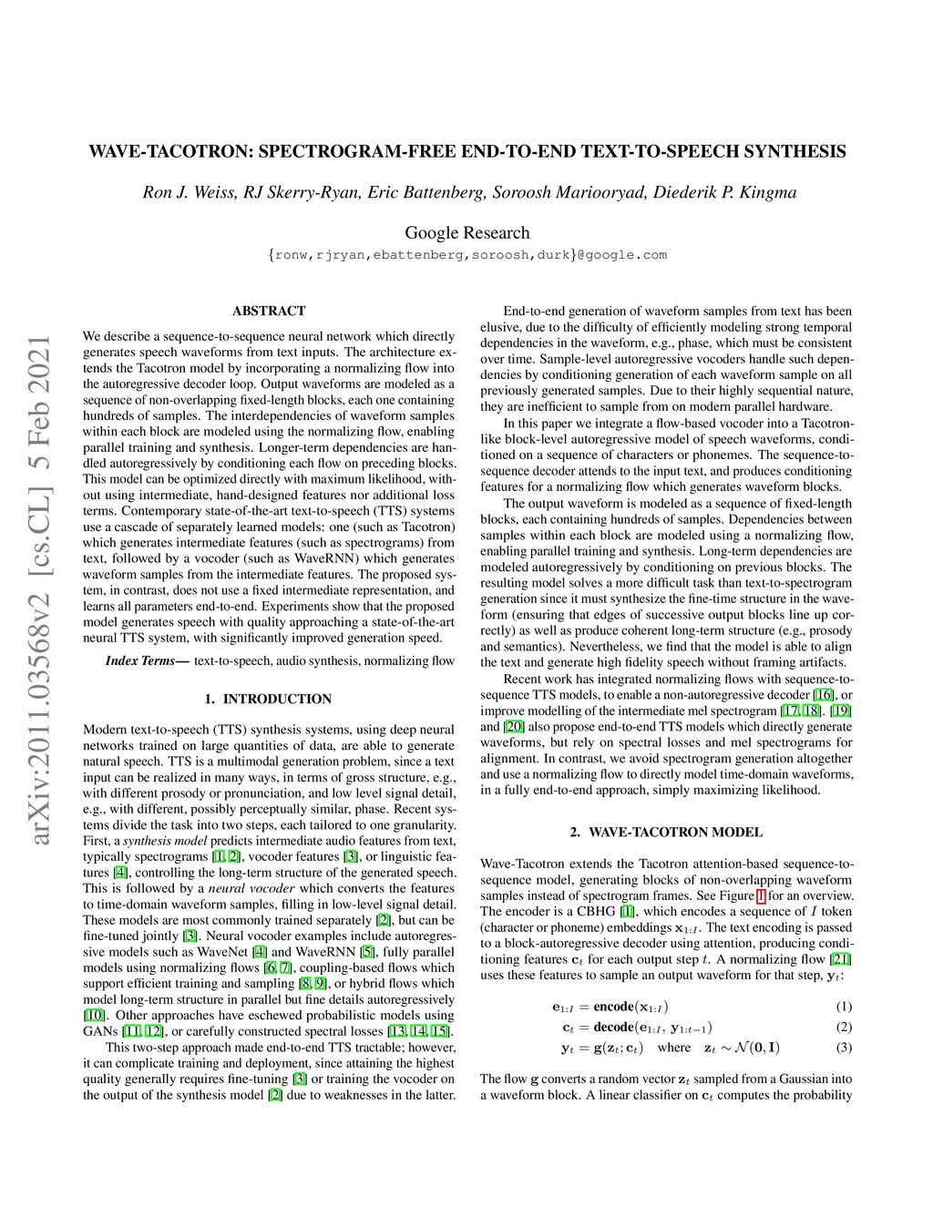 We describe a sequence-to-sequence neural network which directly generates speech waveforms from text inputs. The architecture extends the Tacotron model by incorporating a normalizing flow into the autoregressive decoder loop. Output waveforms are modeled as a sequence of non-overlapping fixed-length blocks, each one containing hundreds of samples. The interdependencies of waveform samples within each block are modeled using the normalizing flow, enabling parallel training and synthesis. Longer-term dependencies are handled autoregressively by conditioning each flow on preceding blocks.This model can be optimized directly with maximum likelihood, with-out using intermediate, hand-designed features nor additional loss terms. Contemporary state-of-the-art text-to-speech (TTS) systems use a cascade of separately learned models: one (such as Tacotron) which generates intermediate features (such as spectrograms) from text, followed by a vocoder (such as WaveRNN) which generates waveform samples from the intermediate features. The proposed system, in contrast, does not use a fixed intermediate representation, and learns all parameters end-to-end. Experiments show that the proposed model generates speech with quality approaching a state-of-the-art neural TTS system, with significantly improved generation speed.