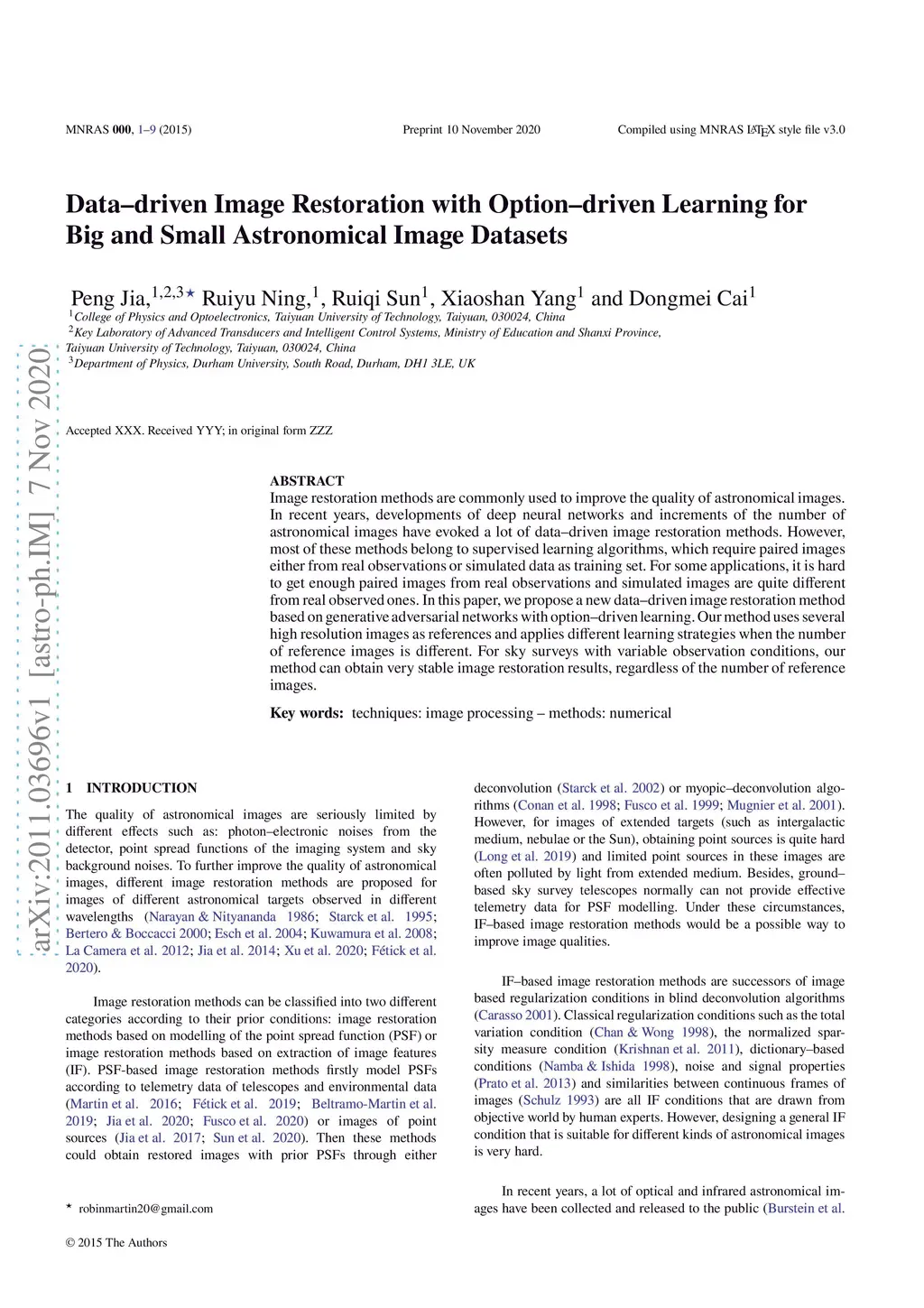 Image restoration methods are commonly used to improve the quality of astronomical images. In recent years, developments of deep neural networks and increments of the number of astronomical images have evoked a lot of data--driven image restoration methods. However, most of these methods belong to supervised learning algorithms, which require paired images either from real observations or simulated data as training set. For some applications, it is hard to get enough paired images from real observations and simulated images are quite different from real observed ones. In this paper, we propose a new data--driven image restoration method based on generative adversarial networks with option--driven learning. Our method uses several high resolution images as references and applies different learning strategies when the number of reference images is different. For sky surveys with variable observation conditions, our method can obtain very stable image restoration results, regardless of the number of reference images.