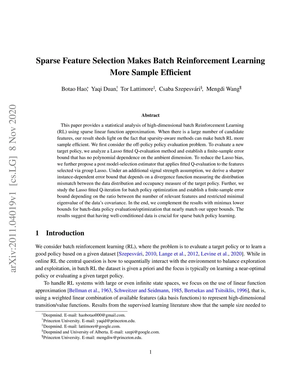Sparse Feature Selection Makes Batch Reinforcement Learning More Sample