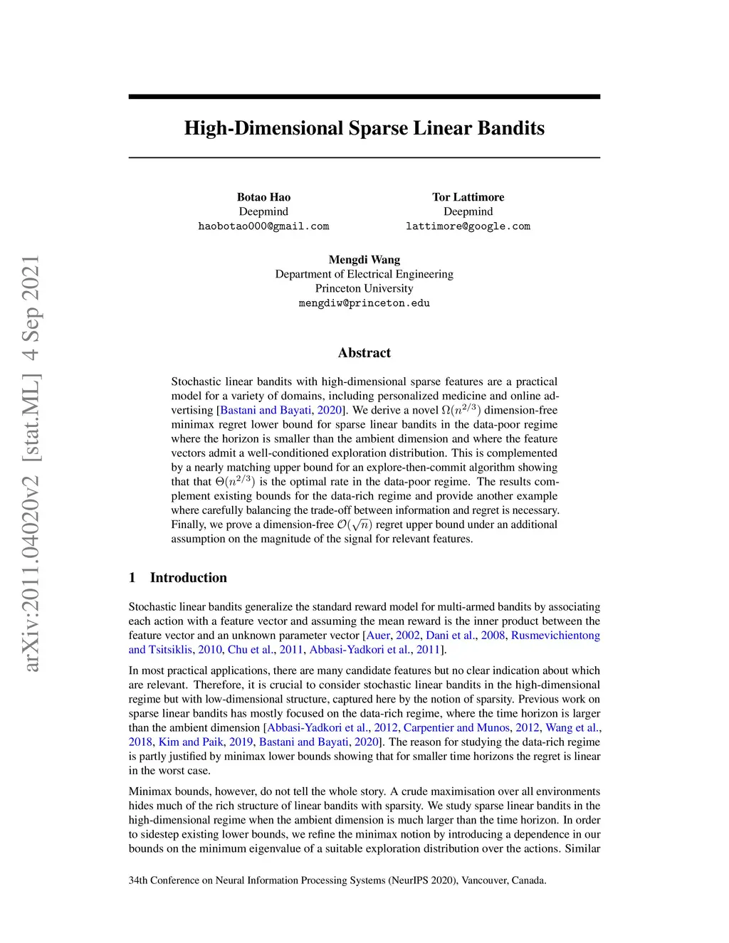 Stochastic linear bandits with high-dimensional sparse features are a practical model for a variety of domains, including personalized medicine and online advertising. We derive a novel dimension-free minimax regret lower bound for sparse linear bandits in the data-poor regime where the horizon is smaller than the ambient dimension and where the feature vectors admit a well-conditioned exploration distribution. This is complemented by a nearly matching upper bound for an explore-then-commit algorithm showing that that is the optimal rate in the data-poor regime. The results complement existing bounds for the data-rich regime and provide another example where carefully balancing the trade-off between information and regret is necessary. Finally, we prove a dimension-free regret upper bound under an additional assumption on the magnitude of the signal for relevant features.