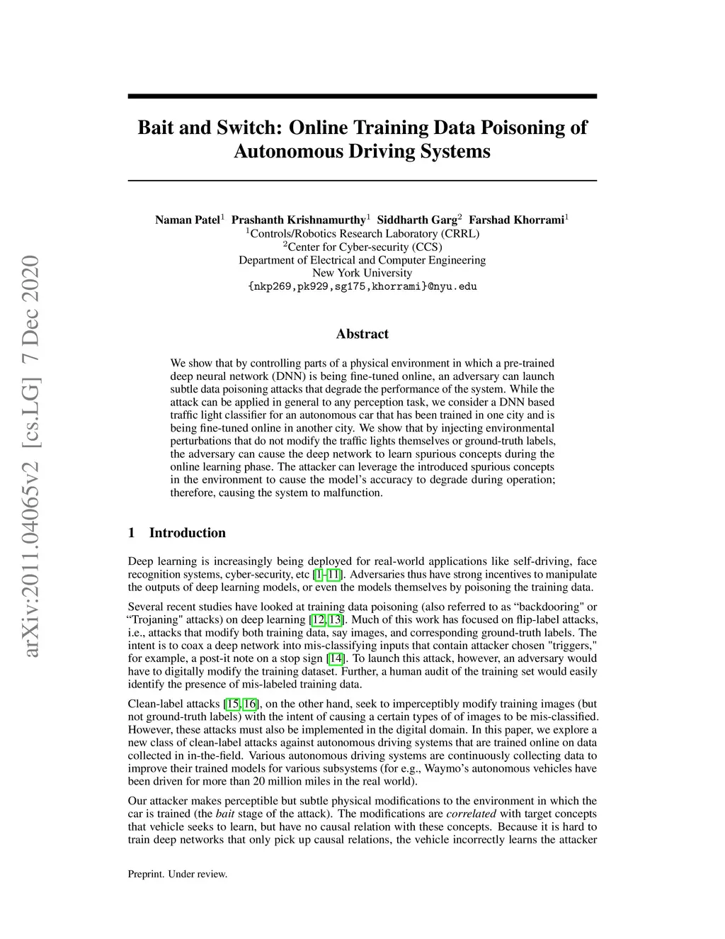 We show that by controlling parts of a physical environment in which a pre-trained deep neural network (DNN) is being fine-tuned online, an adversary can launch subtle data poisoning attacks that degrade the performance of the system. While the attack can be applied in general to any perception task, we consider a DNN based traffic light classifier for an autonomous car that has been trained in one city and is being fine-tuned online in another city. We show that by injecting environmental perturbations that do not modify the traffic lights themselves or ground-truth labels, the adversary can cause the deep network to learn spurious concepts during the online learning phase. The attacker can leverage the introduced spurious concepts in the environment to cause the model's accuracy to degrade during operation; therefore, causing the system to malfunction.