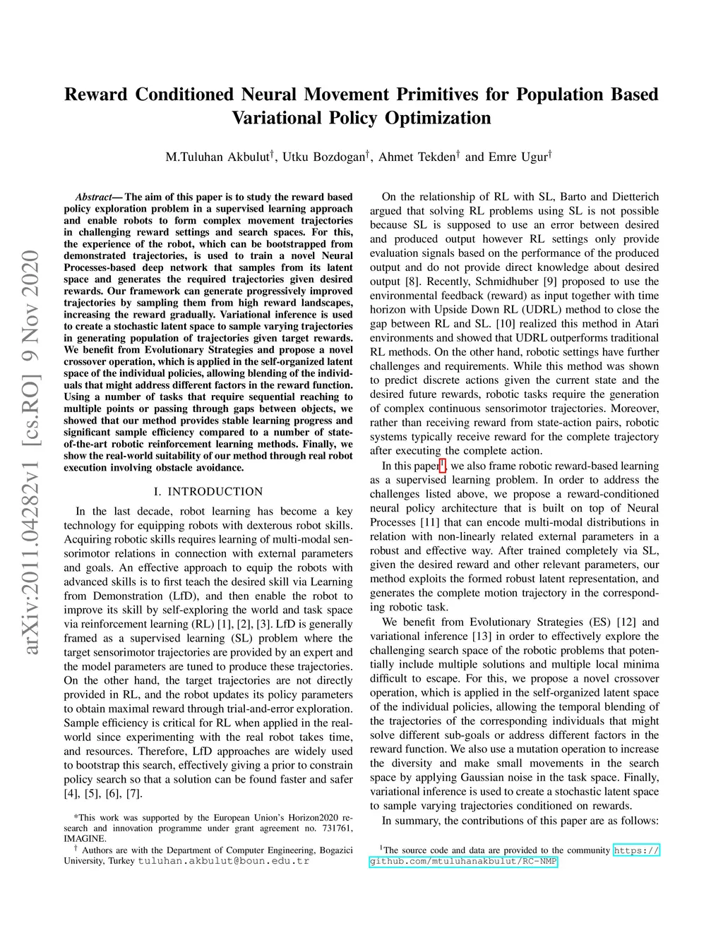 The aim of this paper is to study the reward based policy exploration problem in a supervised learning approach and enable robots to form complex movement trajectories in challenging reward settings and search spaces. For this, the experience of the robot, which can be bootstrapped from demonstrated trajectories, is used to train a novel Neural Processes-based deep network that samples from its latent space and generates the required trajectories given desired rewards. Our framework can generate progressively improved trajectories by sampling them from high reward landscapes, increasing the reward gradually. Variational inference is used to create a stochastic latent space to sample varying trajectories in generating population of trajectories given target rewards. We benefit from Evolutionary Strategies and propose a novel crossover operation, which is applied in the self-organized latent space of the individual policies, allowing blending of the individuals that might address different factors in the reward function. Using a number of tasks that require sequential reaching to multiple points or passing through gaps between objects, we showed that our method provides stable learning progress and significant sample efficiency compared to a number of state-of-the-art robotic reinforcement learning methods. Finally, we show the real-world suitability of our method through real robot execution involving obstacle avoidance.