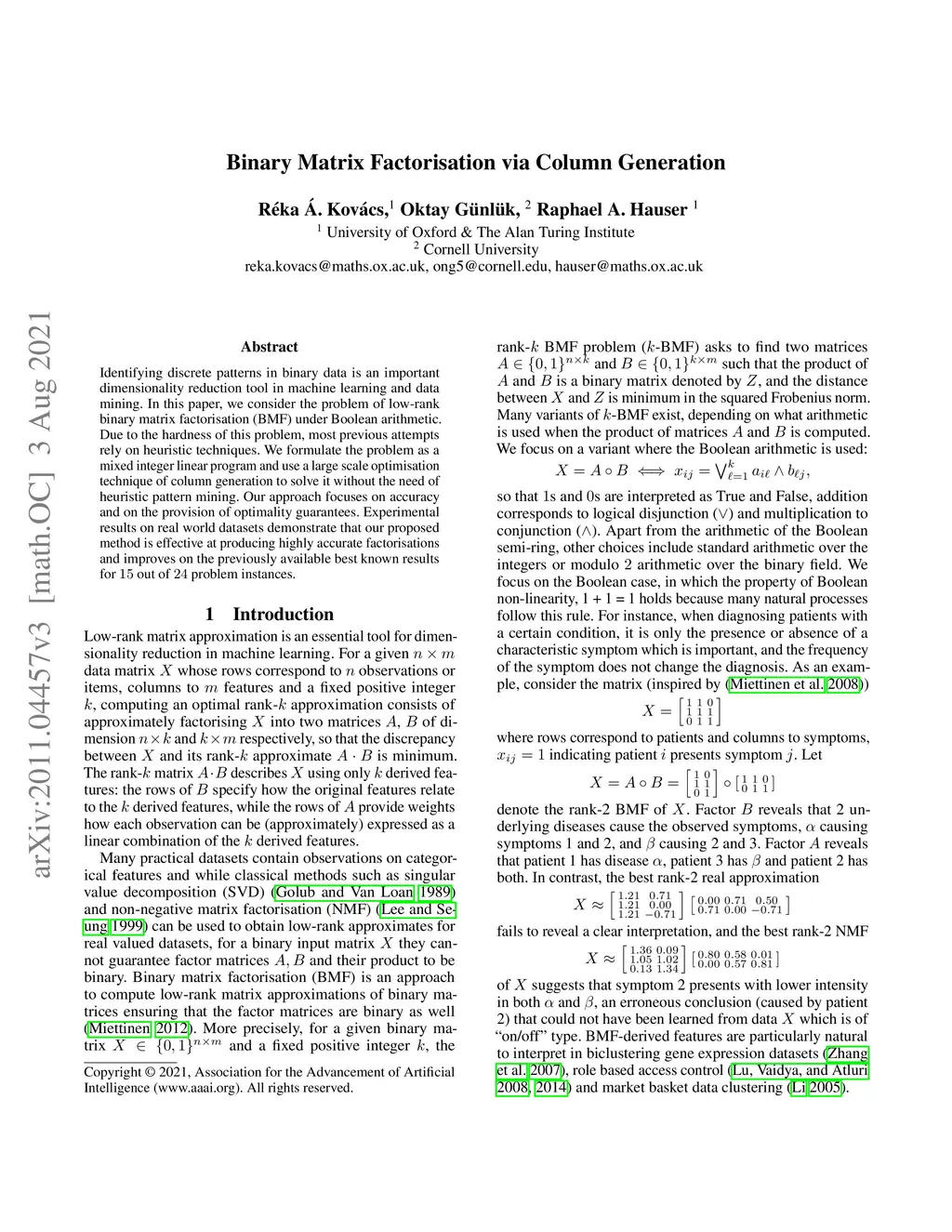 Binary Matrix Factorisation via Column Generation