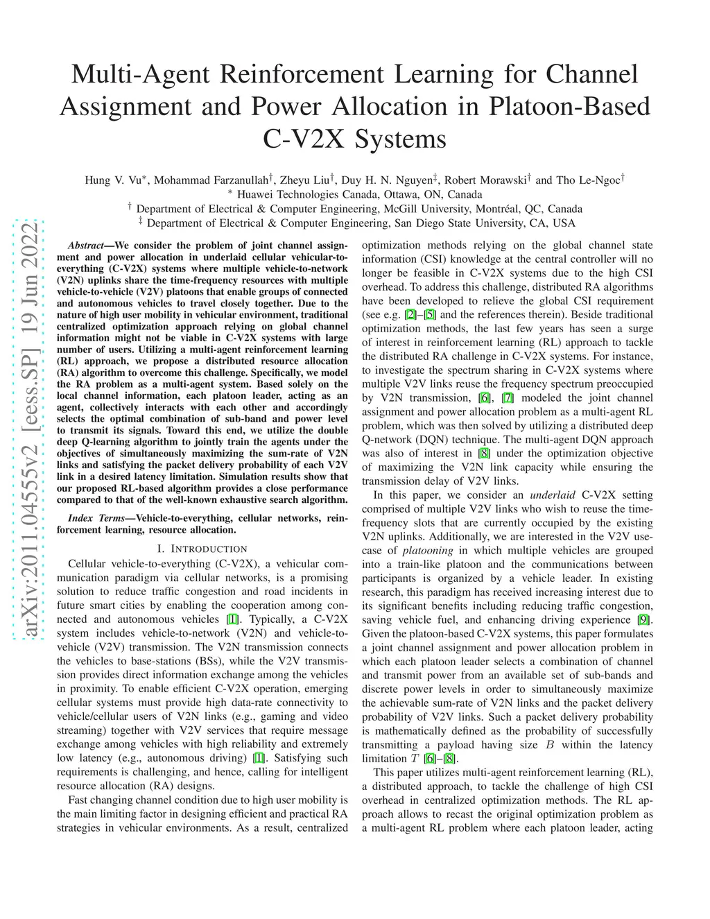 We consider the problem of joint channel assignment and power allocation in underlaid cellular vehicular-to-everything (C-V2X) systems where multiple vehicle-to-network (V2N) uplinks share the time-frequency resources with multiple vehicle-to-vehicle (V2V) platoons that enable groups of connected and autonomous vehicles to travel closely together. Due to the nature of high user mobility in vehicular environment, traditional centralized optimization approach relying on global channel information might not be viable in C-V2X systems with large number of users. Utilizing a multi-agent reinforcement learning (RL) approach, we propose a distributed resource allocation (RA) algorithm to overcome this challenge. Specifically, we model the RA problem as a multi-agent system. Based solely on the local channel information, each platoon leader, acting as an agent, collectively interacts with each other and accordingly selects the optimal combination of sub-band and power level to transmit its signals. Toward this end, we utilize the double deep Q-learning algorithm to jointly train the agents under the objectives of simultaneously maximizing the sum-rate of V2N links and satisfying the packet delivery probability of each V2V link in a desired latency limitation. Simulation results show that our proposed RL-based algorithm provides a close performance compared to that of the well-known exhaustive search algorithm.