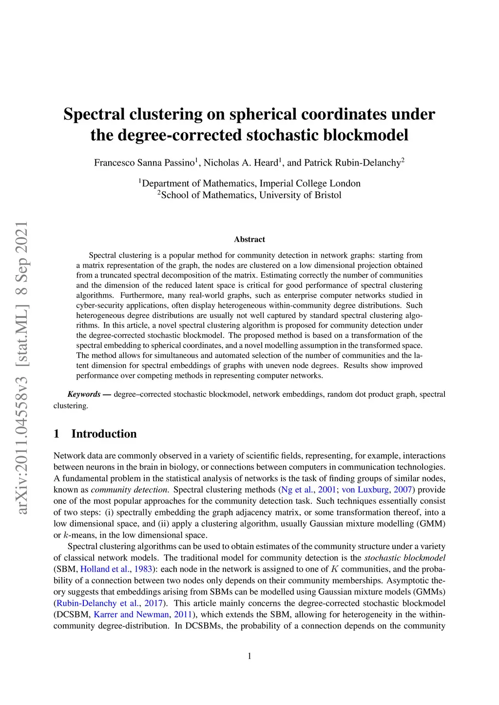 Spectral clustering is a popular method for community detection in network graphs: starting from a matrix representation of the graph, the nodes are clustered on a low dimensional projection obtained from a truncated spectral decomposition of the matrix. Estimating correctly the number of communities and the dimension of the reduced latent space is critical for good performance of spectral clustering algorithms. Furthermore, many real-world graphs, such as enterprise computer networks studied in cyber-security applications, often display heterogeneous within-community degree distributions. Such heterogeneous degree distributions are usually not well captured by standard spectral clustering algorithms. In this article, a novel spectral clustering algorithm is proposed for community detection under the degree-corrected stochastic blockmodel. The proposed method is based on a transformation of the spectral embedding to spherical coordinates, and a novel modelling assumption in the transformed space. The method allows for simultaneous and automated selection of the number of communities and the latent dimension for spectral embeddings of graphs with uneven node degrees. Results show improved performance over competing methods in representing computer networks.