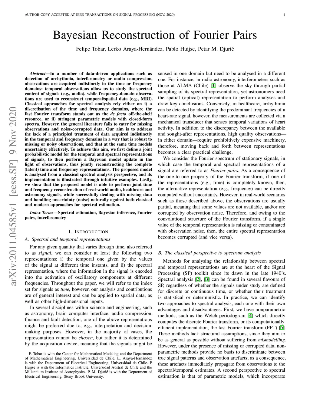 In a number of data-driven applications such as detection of arrhythmia, interferometry or audio compression, observations are acquired indistinctly in the time or frequency domains: temporal observations allow us to study the spectral content of signals (e.g., audio), while frequency-domain observations are used to reconstruct temporal/spatial data (e.g., MRI). Classical approaches for spectral analysis rely either on i) a discretisation of the time and frequency domains, where the fast Fourier transform stands out as the \textit{de facto} off-the-shelf resource, or ii) stringent parametric models with closed-form spectra. However, the general literature fails to cater for missing observations and noise-corrupted data. Our aim is to address the lack of a principled treatment of data acquired indistinctly in the temporal and frequency domains in a way that is robust to missing or noisy observations, and that at the same time models uncertainty effectively. To achieve this aim, we first define a joint probabilistic model for the temporal and spectral representations of signals, to then perform a Bayesian model update in the light of observations, thus jointly reconstructing the complete (latent) time and frequency representations. The proposed model is analysed from a classical spectral analysis perspective, and its implementation is illustrated through intuitive examples. Lastly, we show that the proposed model is able to perform joint time and frequency reconstruction of real-world audio, healthcare and astronomy signals, while successfully dealing with missing data and handling uncertainty (noise) naturally against both classical and modern approaches for spectral estimation.