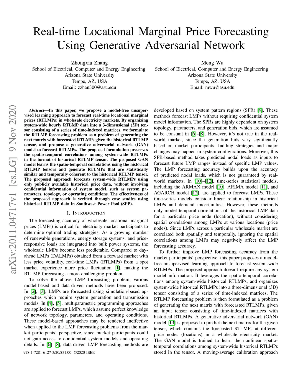 In this paper, we propose a model-free unsupervised learning approach to forecast real-time locational marginal prices (RTLMPs) in wholesale electricity markets. By organizing system-wide hourly RTLMP data into a 3-dimensional (3D) tensor consisting of a series of time-indexed matrices, we formulate the RTLMP forecasting problem as a problem of generating the next matrix with forecasted RTLMPs given the historical RTLMP tensor, and propose a generative adversarial network (GAN) model to forecast RTLMPs. The proposed formulation preserves the spatio-temporal correlations among system-wide RTLMPs in the format of historical RTLMP tensor. The proposed GAN model learns the spatio-temporal correlations using the historical RTLMP tensors and generate RTLMPs that are statistically similar and temporally coherent to the historical RTLMP tensor. The proposed approach forecasts system-wide RTLMPs using only publicly available historical price data, without involving confidential information of system model, such as system parameters, topology, or operating conditions. The effectiveness of the proposed approach is verified through case studies using historical RTLMP data in Southwest Power Pool (SPP).