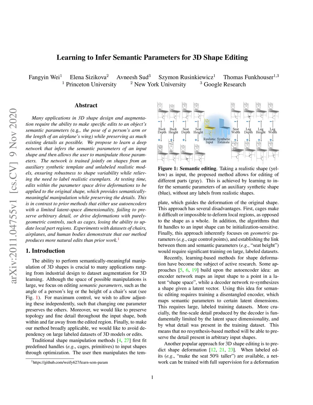 Many applications in 3D shape design and augmentation require the ability to make specific edits to an object's semantic parameters (e.g., the pose of a person's arm or the length of an airplane's wing) while preserving as much existing details as possible. We propose to learn a deep network that infers the semantic parameters of an input shape and then allows the user to manipulate those parameters. The network is trained jointly on shapes from an auxiliary synthetic template and unlabeled realistic models, ensuring robustness to shape variability while relieving the need to label realistic exemplars. At testing time, edits within the parameter space drive deformations to be applied to the original shape, which provides semantically-meaningful manipulation while preserving the details. This is in contrast to prior methods that either use autoencoders with a limited latent-space dimensionality, failing to preserve arbitrary detail, or drive deformations with purely-geometric controls, such as cages, losing the ability to update local part regions. Experiments with datasets of chairs, airplanes, and human bodies demonstrate that our method produces more natural edits than prior work.