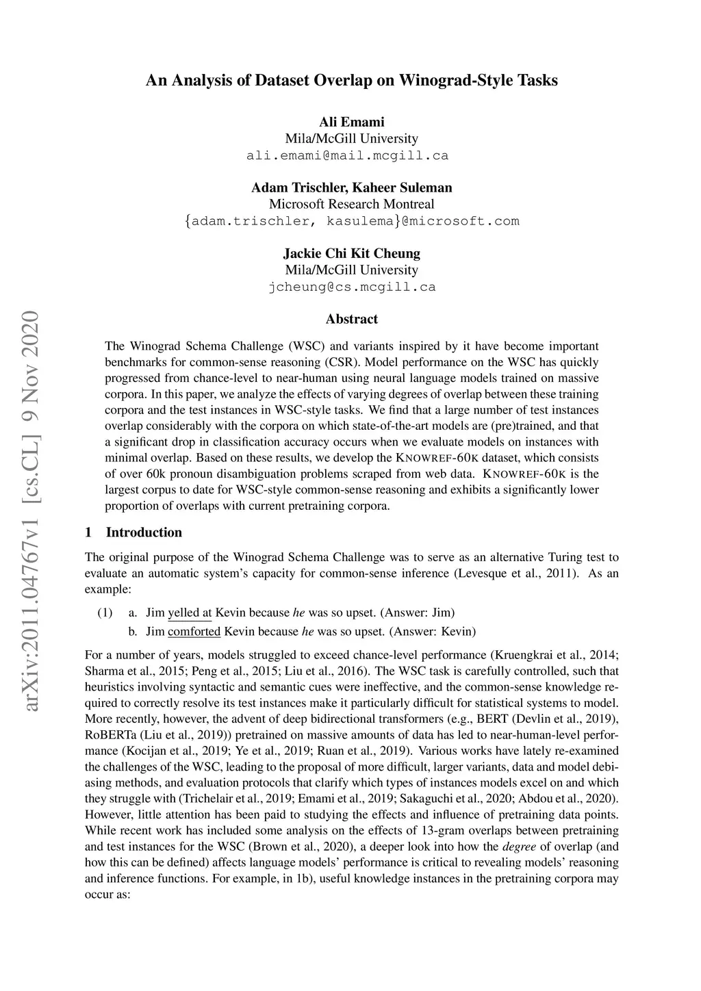 The Winograd Schema Challenge (WSC) and variants inspired by it have become important benchmarks for common-sense reasoning (CSR). Model performance on the WSC has quickly progressed from chance-level to near-human using neural language models trained on massive corpora. In this paper, we analyze the effects of varying degrees of overlap between these training corpora and the test instances in WSC-style tasks. We find that a large number of test instances overlap considerably with the corpora on which state-of-the-art models are (pre)trained, and that a significant drop in classification accuracy occurs when we evaluate models on instances with minimal overlap. Based on these results, we develop the KnowRef-60K dataset, which consists of over 60k pronoun disambiguation problems scraped from web data. KnowRef-60K is the largest corpus to date for WSC-style common-sense reasoning and exhibits a significantly lower proportion of overlaps with current pretraining corpora.