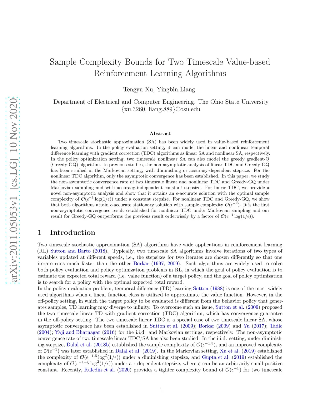 Two timescale stochastic approximation (SA) has been widely used in value-based reinforcement learning algorithms. In the policy evaluation setting, it can model the linear and nonlinear temporal difference learning with gradient correction (TDC) algorithms as linear SA and nonlinear SA, respectively. In the policy optimization setting, two timescale nonlinear SA can also model the greedy gradient-Q (Greedy-GQ) algorithm. In previous studies, the non-asymptotic analysis of linear TDC and Greedy-GQ has been studied in the Markovian setting, with diminishing or accuracy-dependent stepsize. For the nonlinear TDC algorithm, only the asymptotic convergence has been established. In this paper, we study the non-asymptotic convergence rate of two timescale linear and nonlinear TDC and Greedy-GQ under Markovian sampling and with accuracy-independent constant stepsize. For linear TDC, we provide a novel non-asymptotic analysis and show that it attains an -accurate solution with the optimal sample complexity of under a constant stepsize. For nonlinear TDC and Greedy-GQ, we show that both algorithms attain -accurate stationary solution with sample complexity . It is the first non-asymptotic convergence result established for nonlinear TDC under Markovian sampling and our result for Greedy-GQ outperforms the previous result orderwisely by a factor of .