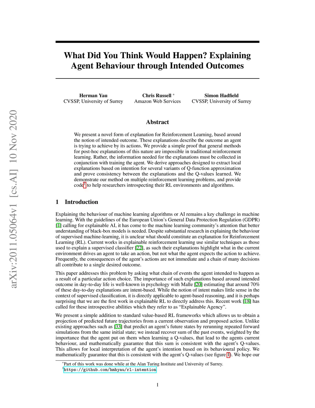 We present a novel form of explanation for Reinforcement Learning, based around the notion of intended outcome. These explanations describe the outcome an agent is trying to achieve by its actions. We provide a simple proof that general methods for post-hoc explanations of this nature are impossible in traditional reinforcement learning. Rather, the information needed for the explanations must be collected in conjunction with training the agent. We derive approaches designed to extract local explanations based on intention for several variants of Q-function approximation and prove consistency between the explanations and the Q-values learned. We demonstrate our method on multiple reinforcement learning problems, and provide code to help researchers introspecting their RL environments and algorithms.