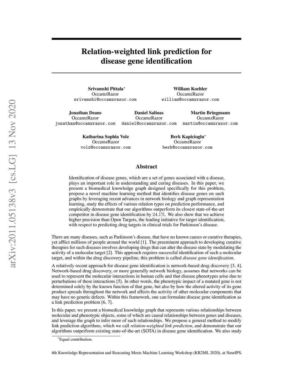 Identification of disease genes, which are a set of genes associated with a disease, plays an important role in understanding and curing diseases. In this paper, we present a biomedical knowledge graph designed specifically for this problem, propose a novel machine learning method that identifies disease genes on such graphs by leveraging recent advances in network biology and graph representation learning, study the effects of various relation types on prediction performance, and empirically demonstrate that our algorithms outperform its closest state-of-the-art competitor in disease gene identification by 24.1%. We also show that we achieve higher precision than Open Targets, the leading initiative for target identification, with respect to predicting drug targets in clinical trials for Parkinson's disease.