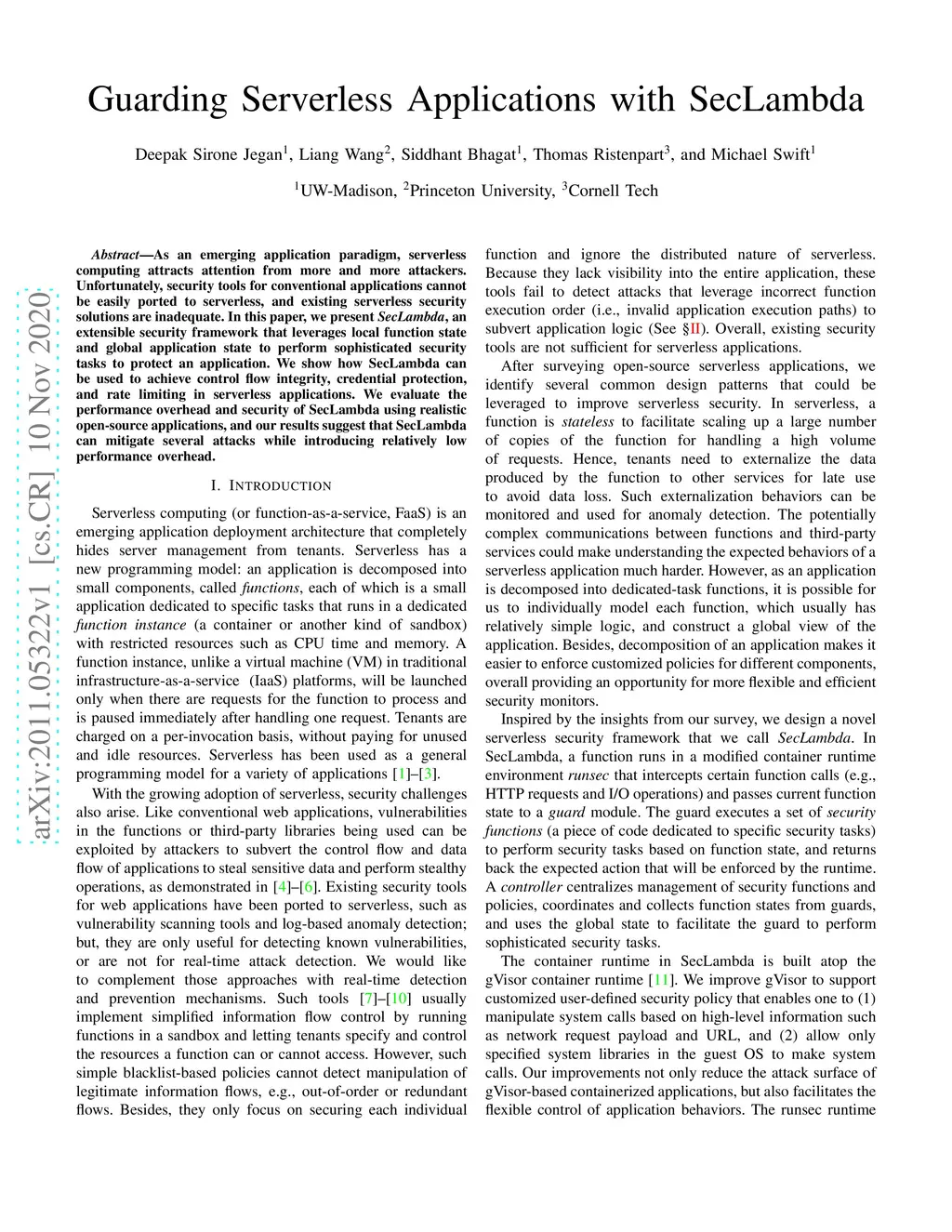 As an emerging application paradigm, serverless computing attracts attention from more and more attackers. Unfortunately, security tools for conventional applications cannot be easily ported to serverless, and existing serverless security solutions are inadequate. In this paper, we present \emph{SecLambda}, an extensible security framework that leverages local function state and global application state to perform sophisticated security tasks to protect an application. We show how SecLambda can be used to achieve control flow integrity, credential protection, and rate limiting in serverless applications. We evaluate the performance overhead and security of SecLambda using realistic open-source applications, and our results suggest that SecLambda can mitigate several attacks while introducing relatively low performance overhead.