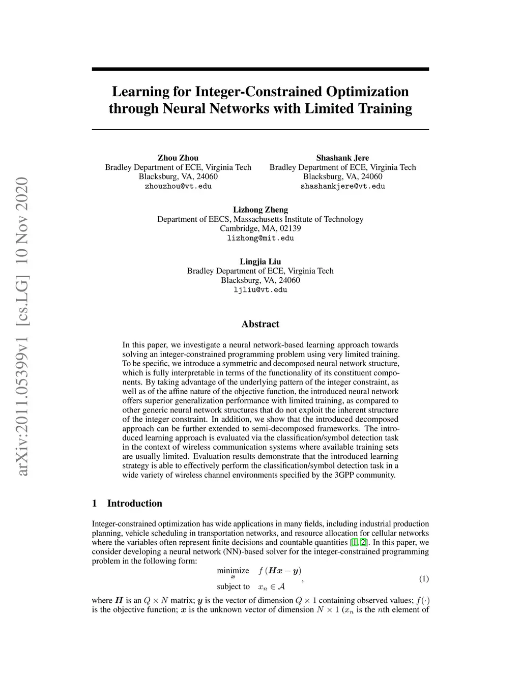 In this paper, we investigate a neural network-based learning approach towards solving an integer-constrained programming problem using very limited training. To be specific, we introduce a symmetric and decomposed neural network structure, which is fully interpretable in terms of the functionality of its constituent components. By taking advantage of the underlying pattern of the integer constraint, as well as of the affine nature of the objective function, the introduced neural network offers superior generalization performance with limited training, as compared to other generic neural network structures that do not exploit the inherent structure of the integer constraint. In addition, we show that the introduced decomposed approach can be further extended to semi-decomposed frameworks. The introduced learning approach is evaluated via the classification/symbol detection task in the context of wireless communication systems where available training sets are usually limited. Evaluation results demonstrate that the introduced learning strategy is able to effectively perform the classification/symbol detection task in a wide variety of wireless channel environments specified by the 3GPP community.