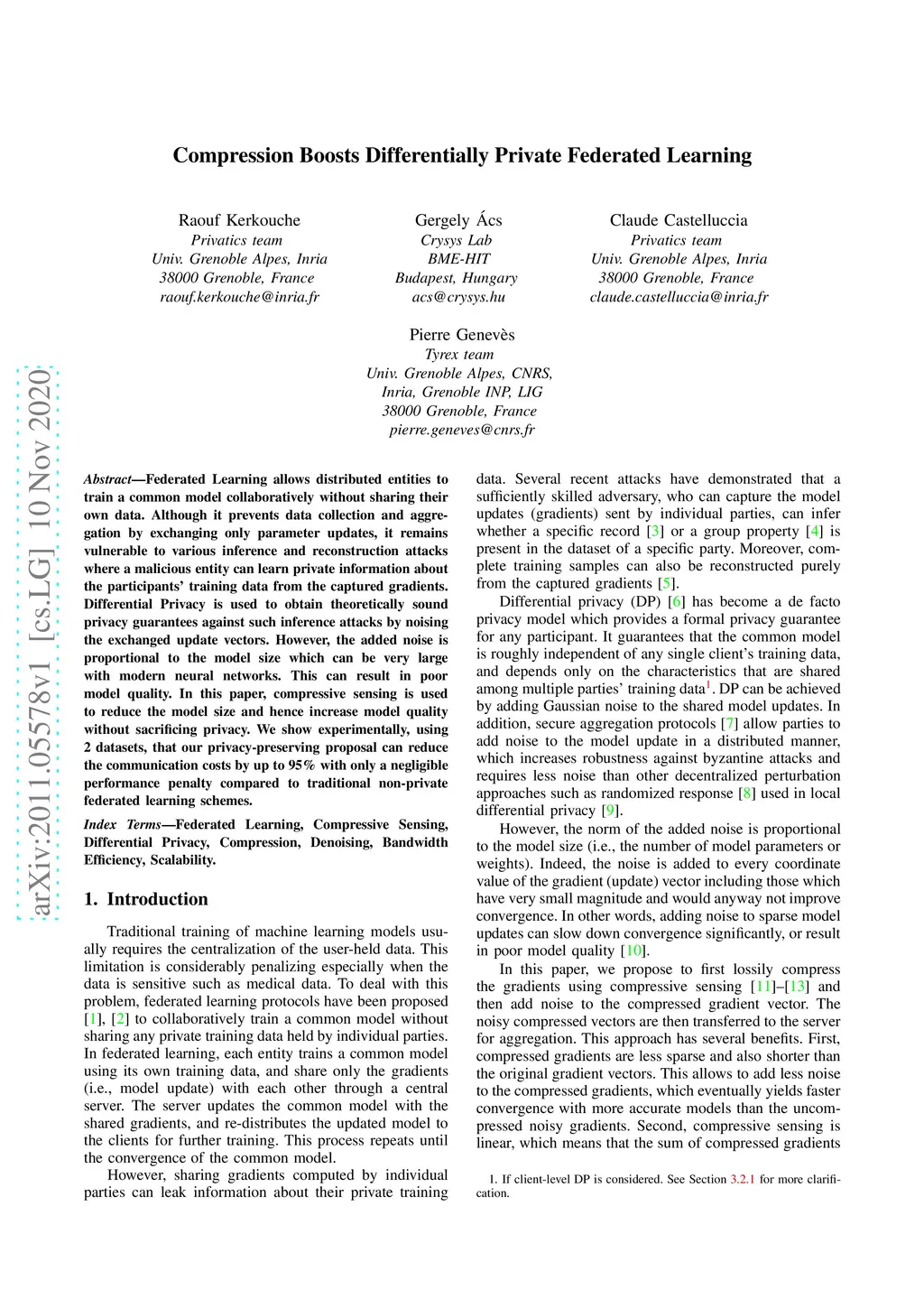 Federated Learning allows distributed entities to train a common model collaboratively without sharing their own data. Although it prevents data collection and aggregation by exchanging only parameter updates, it remains vulnerable to various inference and reconstruction attacks where a malicious entity can learn private information about the participants' training data from the captured gradients. Differential Privacy is used to obtain theoretically sound privacy guarantees against such inference attacks by noising the exchanged update vectors. However, the added noise is proportional to the model size which can be very large with modern neural networks. This can result in poor model quality. In this paper, compressive sensing is used to reduce the model size and hence increase model quality without sacrificing privacy. We show experimentally, using 2 datasets, that our privacy-preserving proposal can reduce the communication costs by up to 95% with only a negligible performance penalty compared to traditional non-private federated learning schemes.