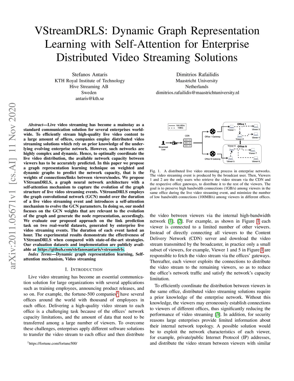 Live video streaming has become a mainstay as a standard communication solution for several enterprises worldwide. To efficiently stream high-quality live video content to a large amount of offices, companies employ distributed video streaming solutions which rely on prior knowledge of the underlying evolving enterprise network. However, such networks are highly complex and dynamic. Hence, to optimally coordinate the live video distribution, the available network capacity between viewers has to be accurately predicted. In this paper we propose a graph representation learning technique on weighted and dynamic graphs to predict the network capacity, that is the weights of connections/links between viewers/nodes. We propose VStreamDRLS, a graph neural network architecture with a self-attention mechanism to capture the evolution of the graph structure of live video streaming events. VStreamDRLS employs the graph convolutional network (GCN) model over the duration of a live video streaming event and introduces a self-attention mechanism to evolve the GCN parameters. In doing so, our model focuses on the GCN weights that are relevant to the evolution of the graph and generate the node representation, accordingly. We evaluate our proposed approach on the link prediction task on two real-world datasets, generated by enterprise live video streaming events. The duration of each event lasted an hour. The experimental results demonstrate the effectiveness of VStreamDRLS when compared with state-of-the-art strategies. Our evaluation datasets and implementation are publicly available at https://github.com/stefanosantaris/vstreamdrls