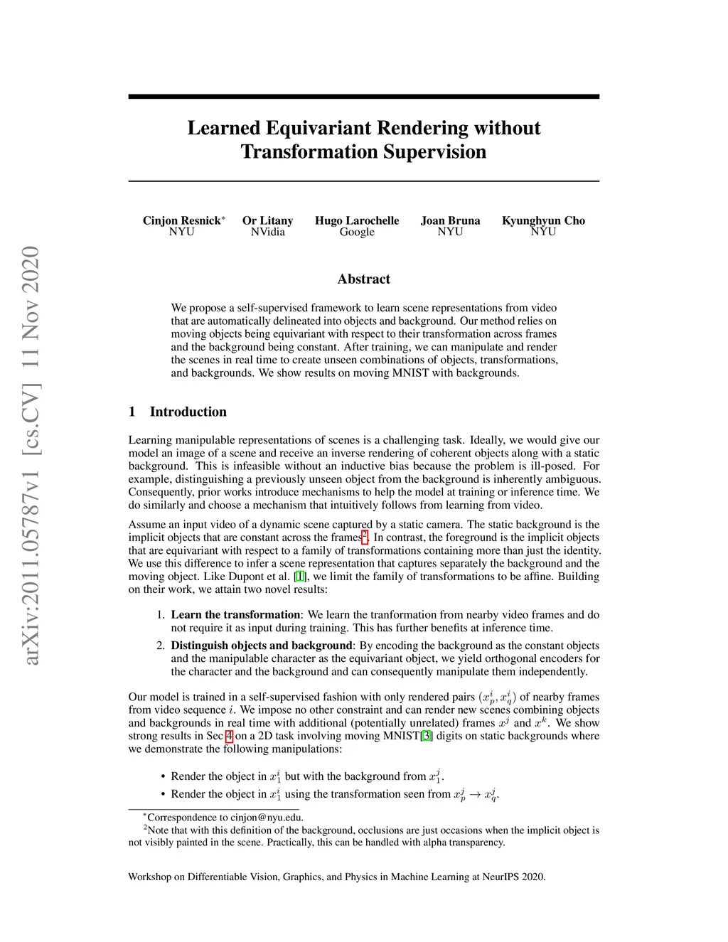 We propose a self-supervised framework to learn scene representations from video that are automatically delineated into objects and background. Our method relies on moving objects being equivariant with respect to their transformation across frames and the background being constant. After training, we can manipulate and render the scenes in real time to create unseen combinations of objects, transformations, and backgrounds. We show results on moving MNIST with backgrounds.