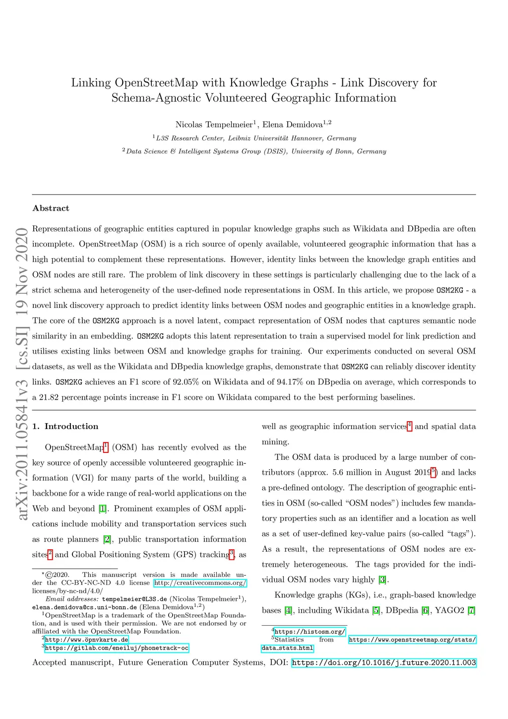 Representations of geographic entities captured in popular knowledge graphs such as Wikidata and DBpedia are often incomplete. OpenStreetMap (OSM) is a rich source of openly available, volunteered geographic information that has a high potential to complement these representations. However, identity links between the knowledge graph entities and OSM nodes are still rare. The problem of link discovery in these settings is particularly challenging due to the lack of a strict schema and heterogeneity of the user-defined node representations in OSM. In this article, we propose OSM2KG - a novel link discovery approach to predict identity links between OSM nodes and geographic entities in a knowledge graph. The core of the OSM2KG approach is a novel latent, compact representation of OSM nodes that captures semantic node similarity in an embedding. OSM2KG adopts this latent representation to train a supervised model for link prediction and utilises existing links between OSM and knowledge graphs for training. Our experiments conducted on several OSM datasets, as well as the Wikidata and DBpedia knowledge graphs, demonstrate that OSM2KG can reliably discover identity links. OSM2KG achieves an F1 score of 92.05% on Wikidata and of 94.17% on DBpedia on average, which corresponds to a 21.82 percentage points increase in F1 score on Wikidata compared to the best performing baselines.