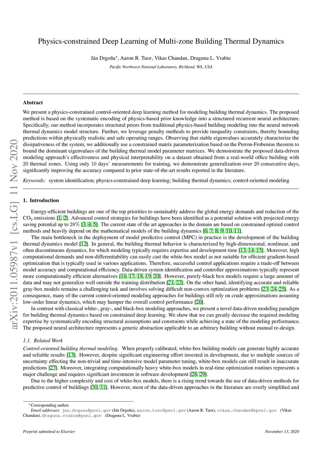 We present a physics-constrained control-oriented deep learning method for modeling building thermal dynamics. The proposed method is based on the systematic encoding of physics-based prior knowledge into a structured recurrent neural architecture. Specifically, our method incorporates structural priors from traditional physics-based building modeling into the neural network thermal dynamics model structure. Further, we leverage penalty methods to provide inequality constraints, thereby bounding predictions within physically realistic and safe operating ranges. Observing that stable eigenvalues accurately characterize the dissipativeness of the system, we additionally use a constrained matrix parameterization based on the Perron-Frobenius theorem to bound the dominant eigenvalues of the building thermal model parameter matrices. We demonstrate the proposed data-driven modeling approach's effectiveness and physical interpretability on a dataset obtained from a real-world office building with 20 thermal zones. Using only 10 days' measurements for training, we demonstrate generalization over 20 consecutive days, significantly improving the accuracy compared to prior state-of-the-art results reported in the literature.