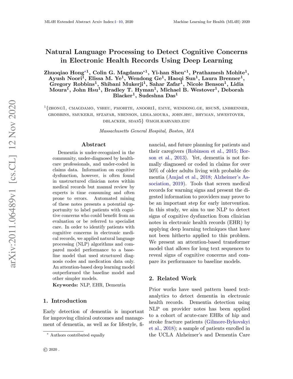 Dementia is under-recognized in the community, under-diagnosed by healthcare professionals, and under-coded in claims data. Information on cognitive dysfunction, however, is often found in unstructured clinician notes within medical records but manual review by experts is time consuming and often prone to errors. Automated mining of these notes presents a potential opportunity to label patients with cognitive concerns who could benefit from an evaluation or be referred to specialist care. In order to identify patients with cognitive concerns in electronic medical records, we applied natural language processing (NLP) algorithms and compared model performance to a baseline model that used structured diagnosis codes and medication data only. An attention-based deep learning model outperformed the baseline model and other simpler models.