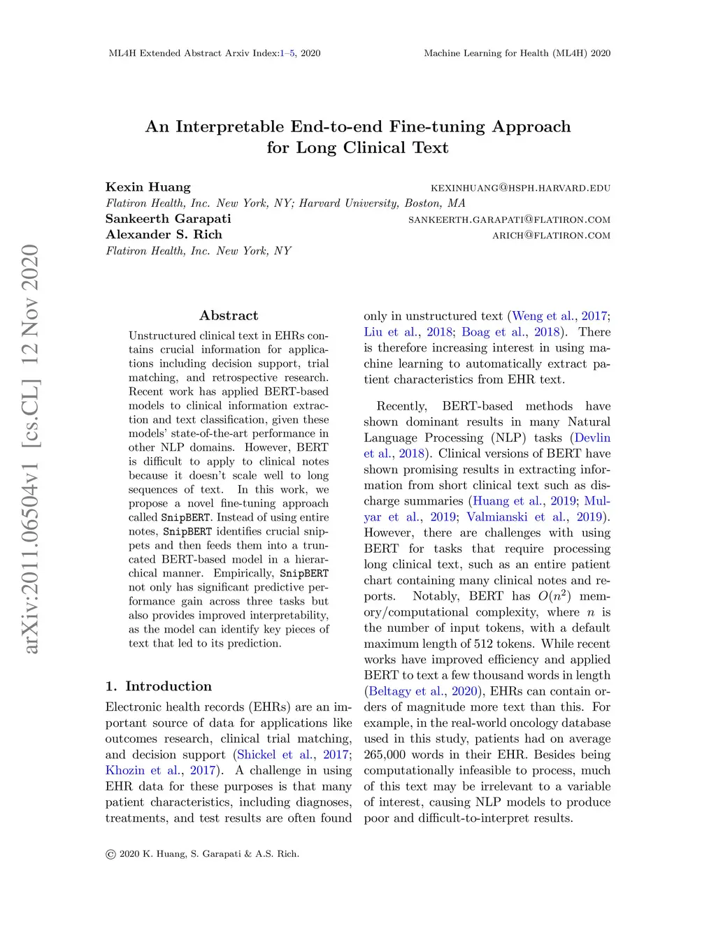 Unstructured clinical text in EHRs contains crucial information for applications including decision support, trial matching, and retrospective research. Recent work has applied BERT-based models to clinical information extraction and text classification, given these models' state-of-the-art performance in other NLP domains. However, BERT is difficult to apply to clinical notes because it doesn't scale well to long sequences of text. In this work, we propose a novel fine-tuning approach called SnipBERT. Instead of using entire notes, SnipBERT identifies crucial snippets and then feeds them into a truncated BERT-based model in a hierarchical manner. Empirically, SnipBERT not only has significant predictive performance gain across three tasks but also provides improved interpretability, as the model can identify key pieces of text that led to its prediction.