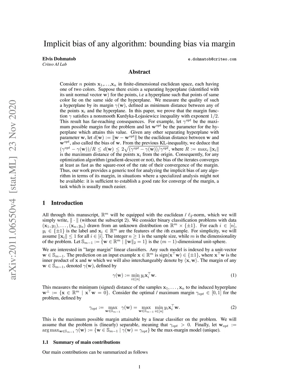 Consider points in finite-dimensional euclidean space, each having one of two colors. Suppose there exists a separating hyperplane (identified with its unit normal vector for the points, i.e a hyperplane such that points of same color lie on the same side of the hyperplane. We measure the quality of such a hyperplane by its margin , defined as minimum distance between any of the points and the hyperplane. In this paper, we prove that the margin function satisfies a nonsmooth Kurdyka-Lojasiewicz inequality with exponent . This result has far-reaching consequences. For example, let be the maximum possible margin for the problem and let be the parameter for the hyperplane which attains this value. Given any other separating hyperplane with parameter , let be the euclidean distance between and , also called the bias of . From the previous KL-inequality, we deduce that , where is the maximum distance of the points from the origin. Consequently, for any optimization algorithm (gradient-descent or not), the bias of the iterates converges at least as fast as the square-root of the rate of their convergence of the margin. Thus, our work provides a generic tool for analyzing the implicit bias of any algorithm in terms of its margin, in situations where a specialized analysis might not be available: it is sufficient to establish a good rate for converge of the margin, a task which is usually much easier.