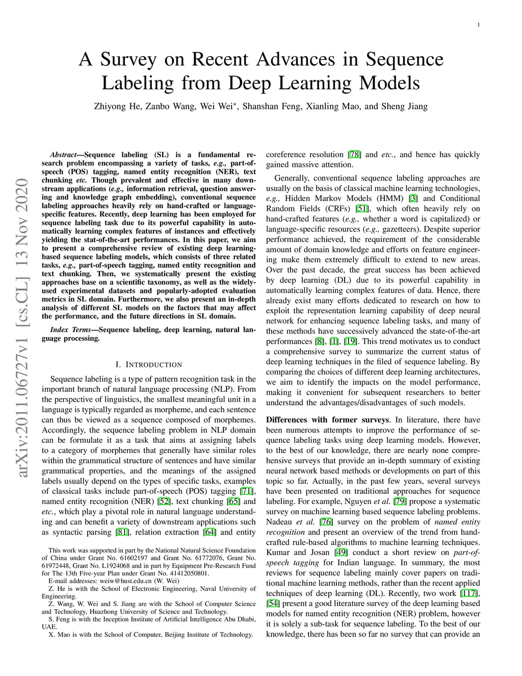 Sequence labeling (SL) is a fundamental research problem encompassing a variety of tasks, e.g., part-of-speech (POS) tagging, named entity recognition (NER), text chunking, etc. Though prevalent and effective in many downstream applications (e.g., information retrieval, question answering, and knowledge graph embedding), conventional sequence labeling approaches heavily rely on hand-crafted or language-specific features. Recently, deep learning has been employed for sequence labeling tasks due to its powerful capability in automatically learning complex features of instances and effectively yielding the stat-of-the-art performances. In this paper, we aim to present a comprehensive review of existing deep learning-based sequence labeling models, which consists of three related tasks, e.g., part-of-speech tagging, named entity recognition, and text chunking. Then, we systematically present the existing approaches base on a scientific taxonomy, as well as the widely-used experimental datasets and popularly-adopted evaluation metrics in the SL domain. Furthermore, we also present an in-depth analysis of different SL models on the factors that may affect the performance and future directions in the SL domain.